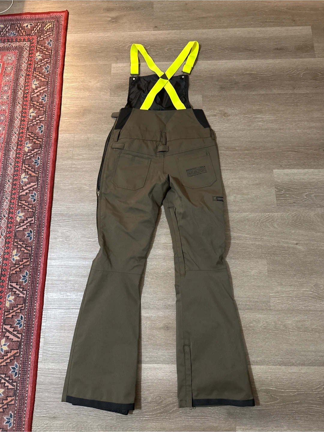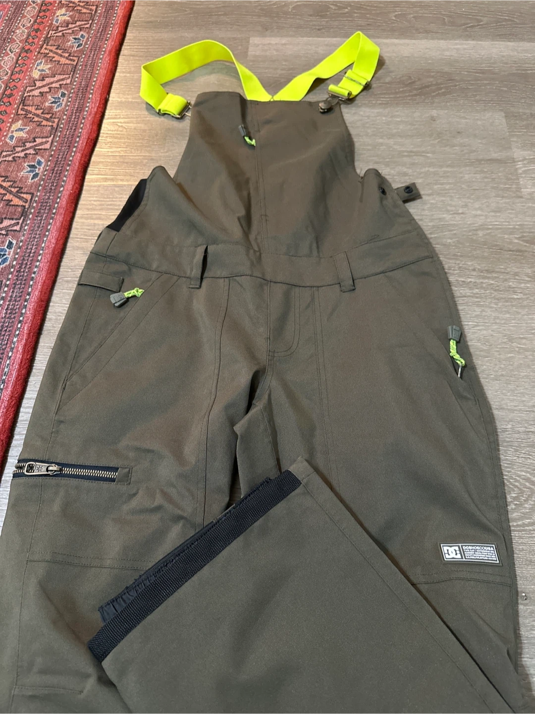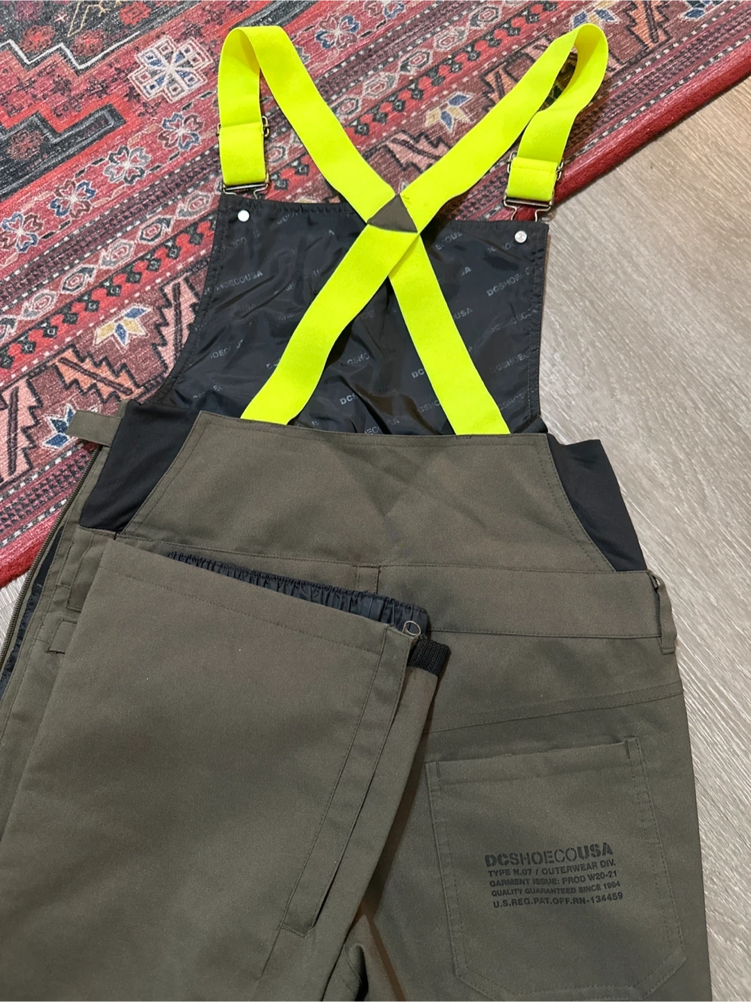 DC unisex snow bib overalls in olive green. Size S. VERY SLIM. Features neon yellow suspenders and multiple zippered pockets.