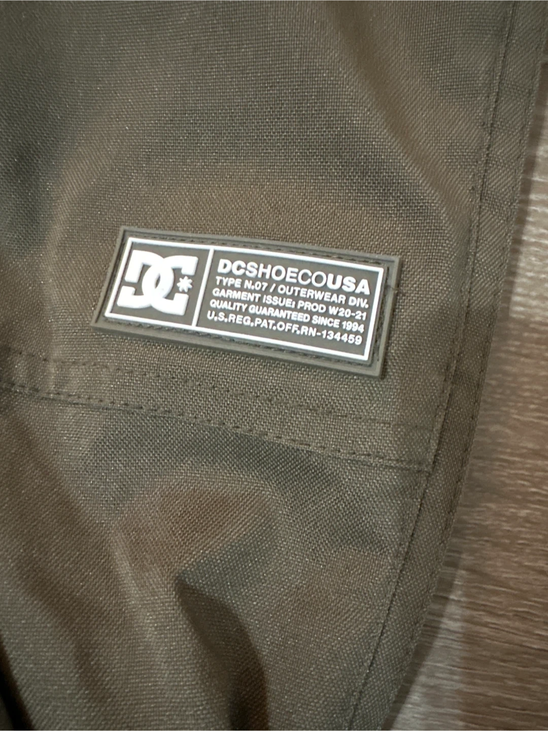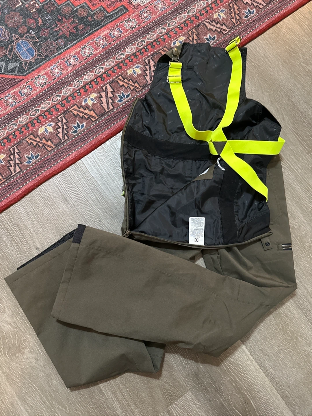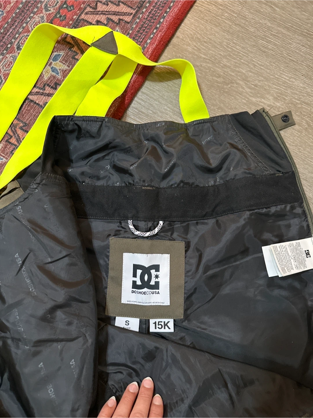 DC unisex snow bib overalls in olive green. Size S. VERY SLIM. Features neon yellow suspenders and multiple zippered pockets.