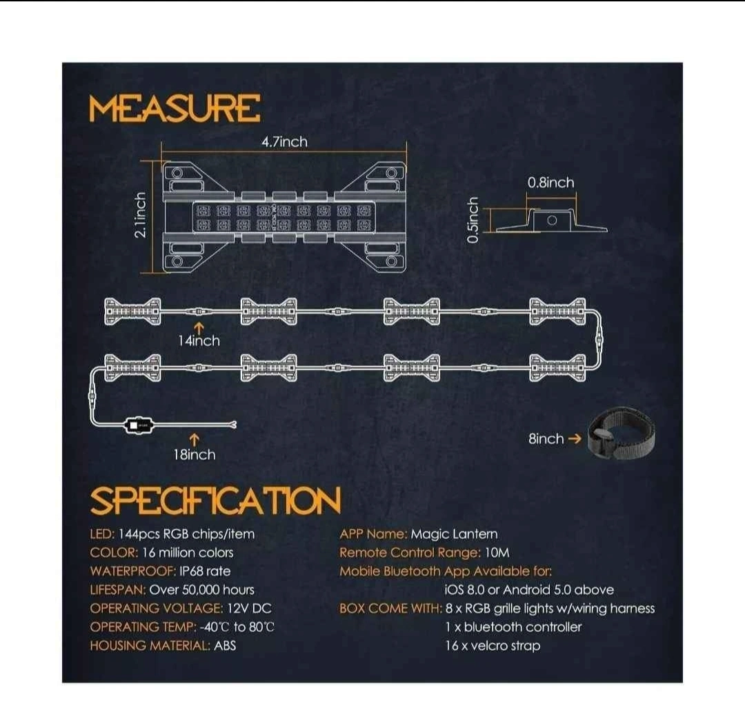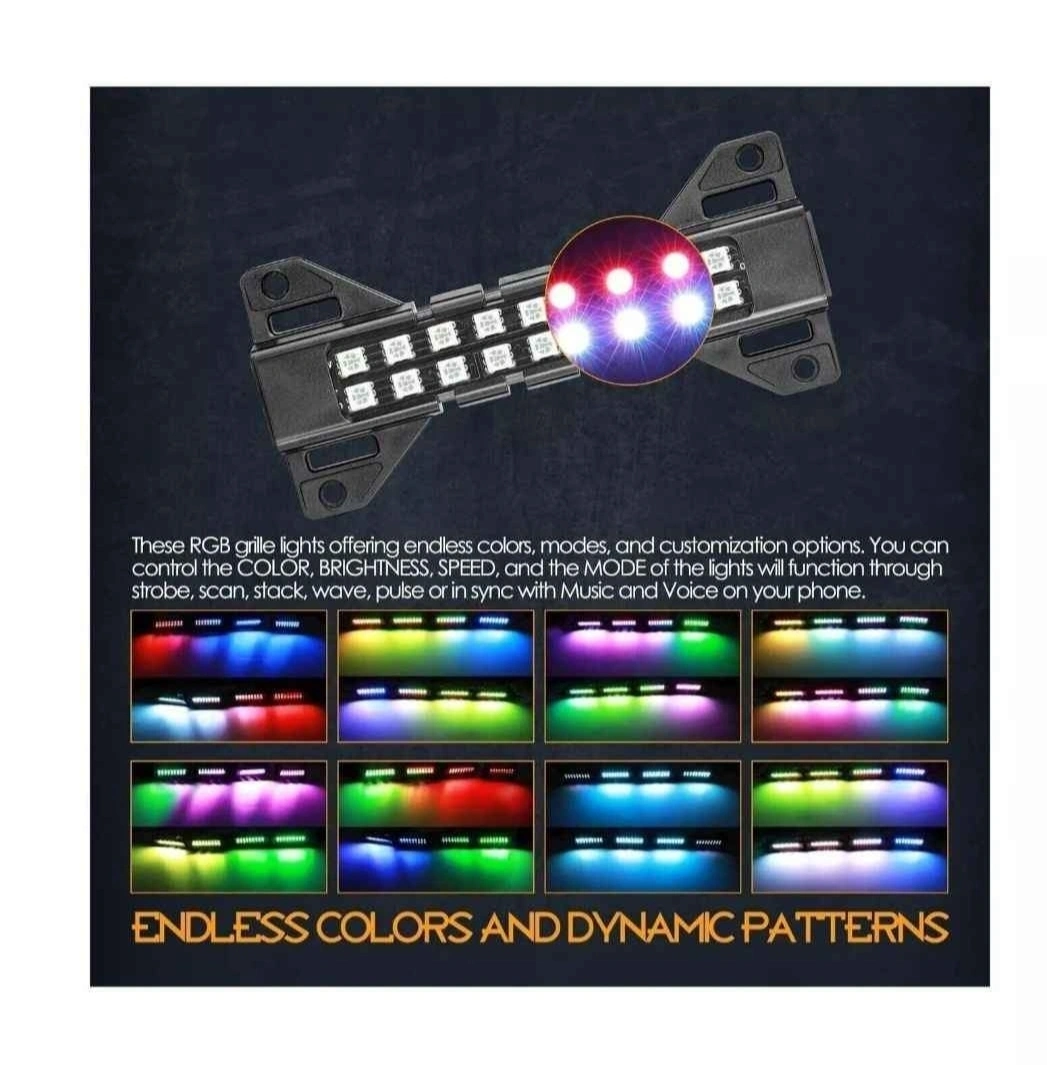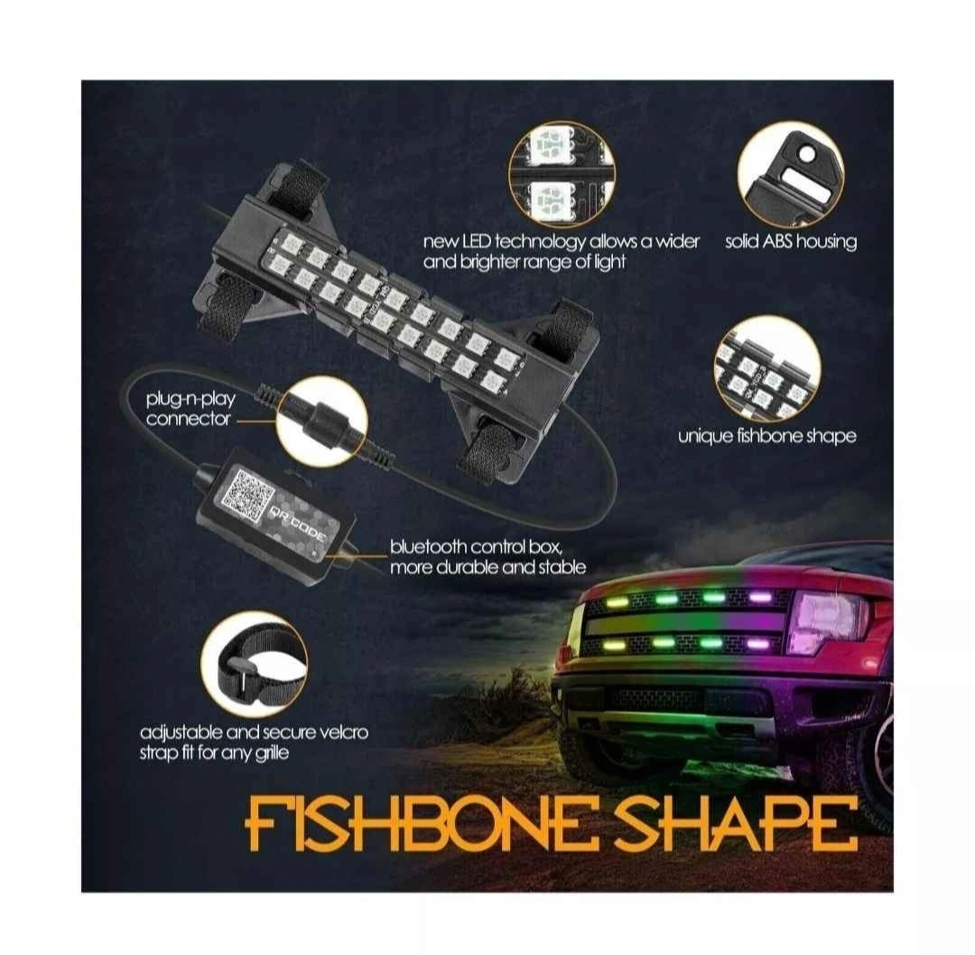 Sale for brand new RGB LED Grille Light Kit Raptor Lights Strobe Lights Rock Lights Truck Grill Lights for Car SUV ATV UTV Grille Accessories - 8 Pods Features: OVERVIEW - Nirider latest fishbone shape 8 pods RGB LED grille light kit offering endless colors, blinking patterns, dynamic modes, and customization options, giving your vehicle a unique look. The flood beam design offers a wider and brighter spread of light to make your vehicle stand out at day and night. ENDLESS FUN - Simply download the APP, you can control 16 million Colors, Brightness, Speed, and the Dynamic Mode of the lights will function through strobe, scan, stack, or in sync with Music and Voice. EASY & CLEAN - The universal Car Grille Lights feature plug-n-play connectors for easy installation. The adjustable and secure velcro straps fit for any shape or OEM front grille. Fit all sizes of vehicles. Perfect for adding some flair or the raptor light look to your vehicle. DURABILITY - These raptor