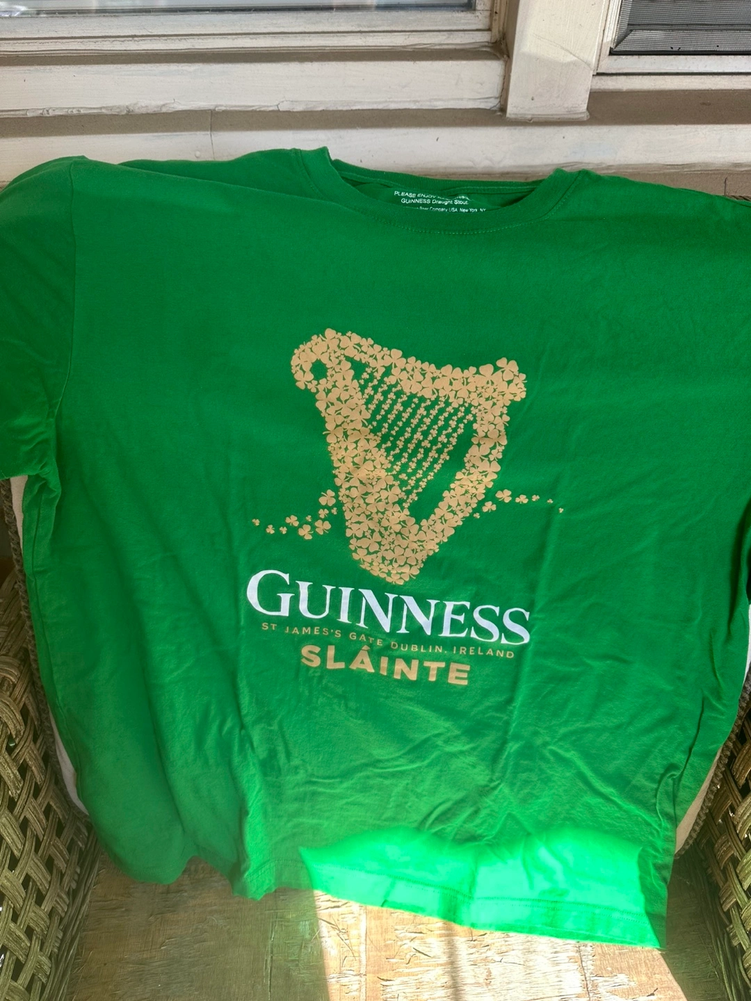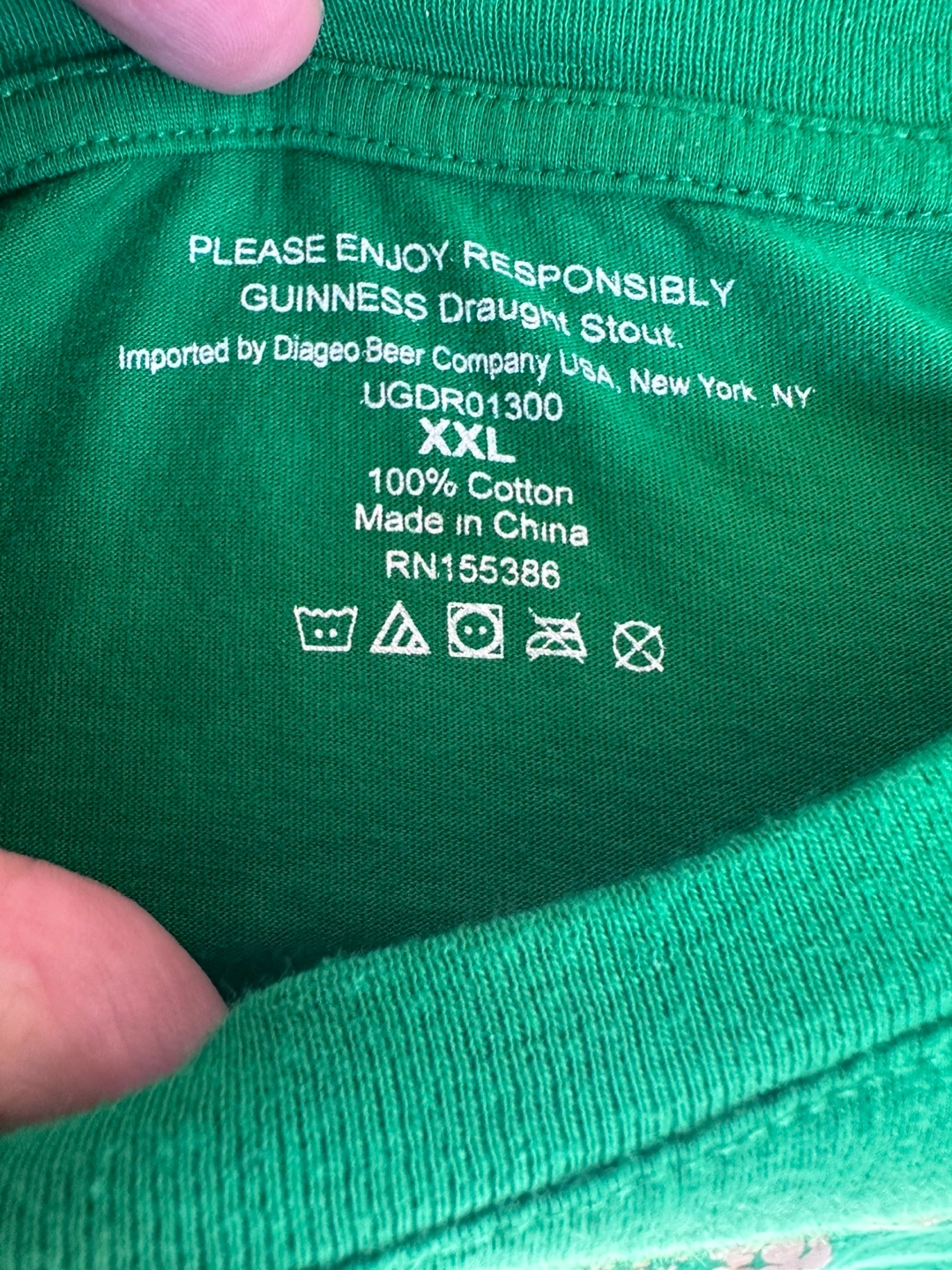 Selling a green Guinness t-shirt, size XXL. It features the iconic Guinness harp logo and the words "St. James's Gate Dublin Ireland" printed on the front. The shirt is made of 100% cotton. Clean up my closet.