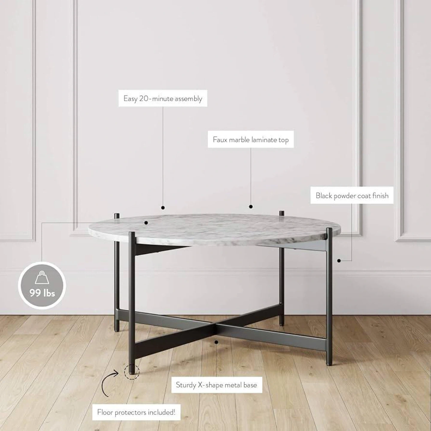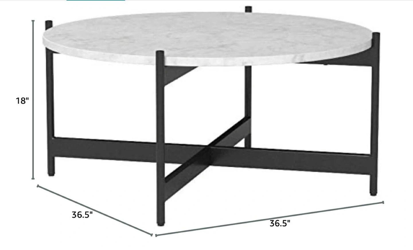 This coffee table features a faux marble laminate top and a sturdy X-shape metal base. It has a black powder coat finish and includes floor protectors. The table is 36.5" x 36.5" and 18" tall.