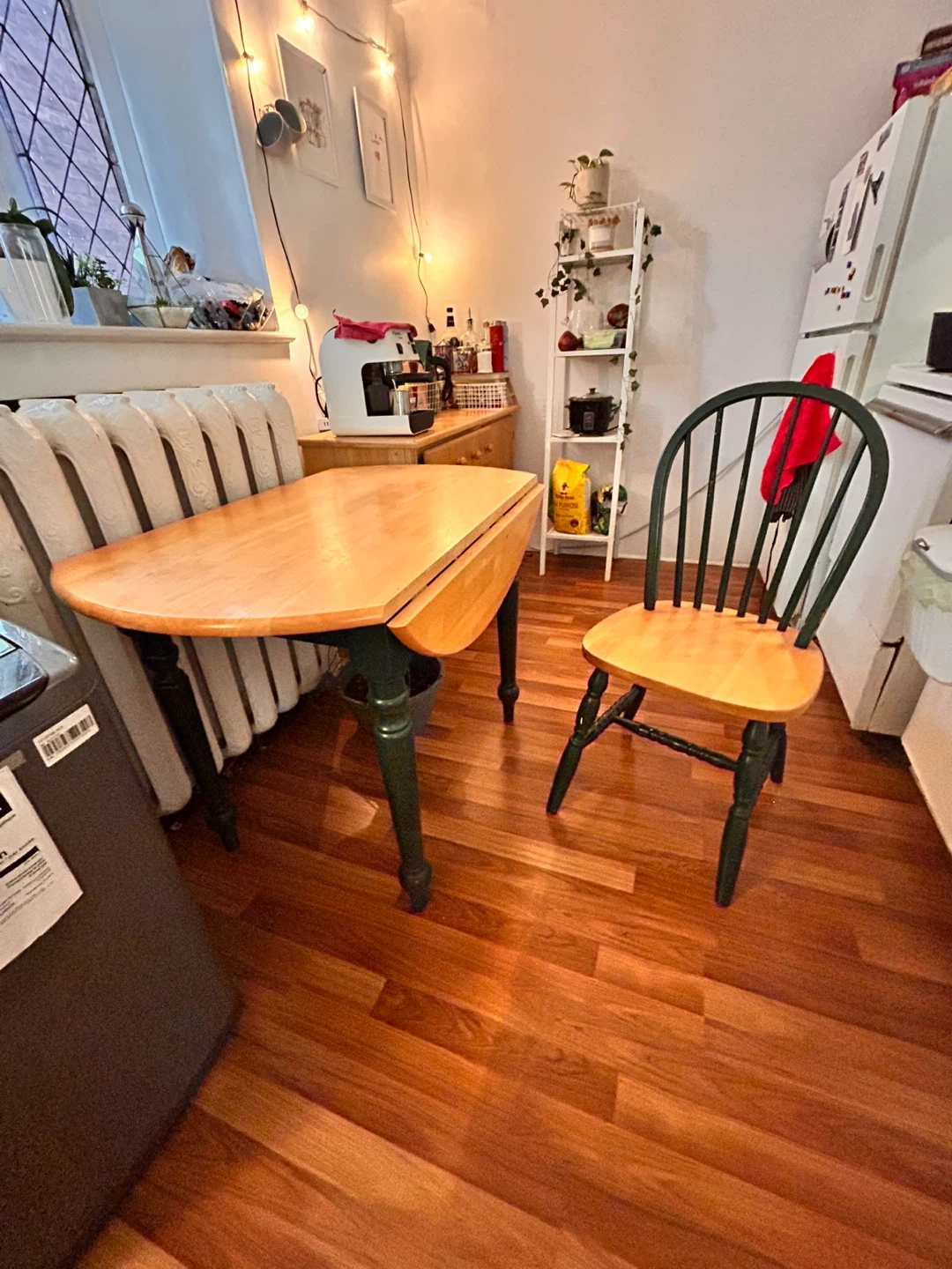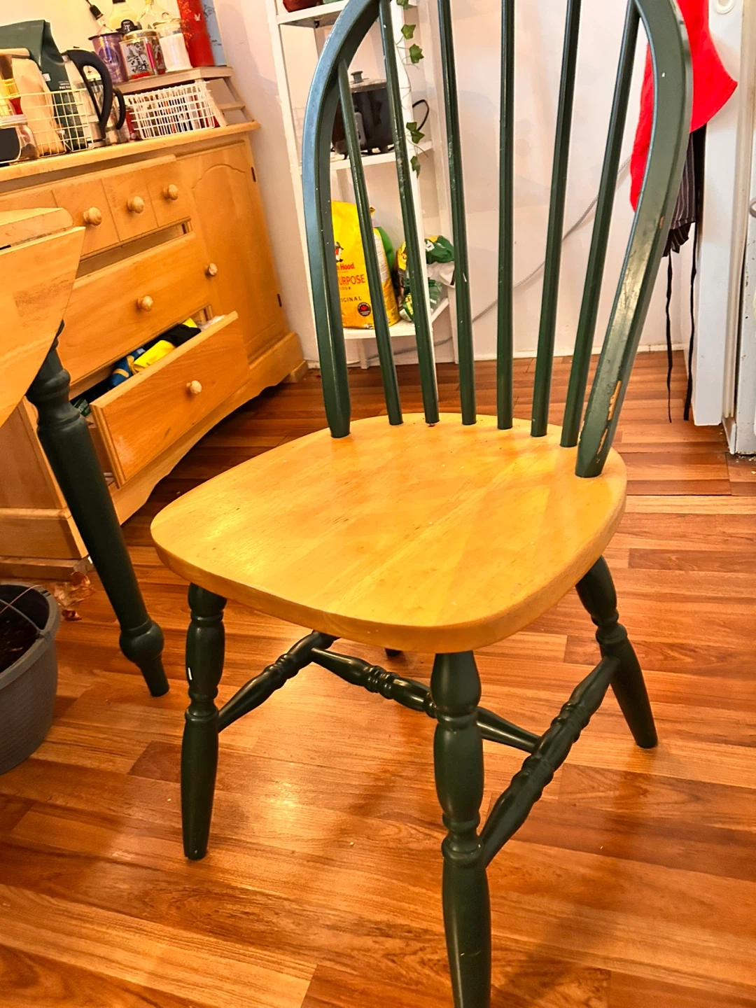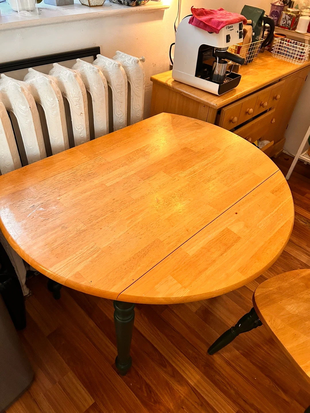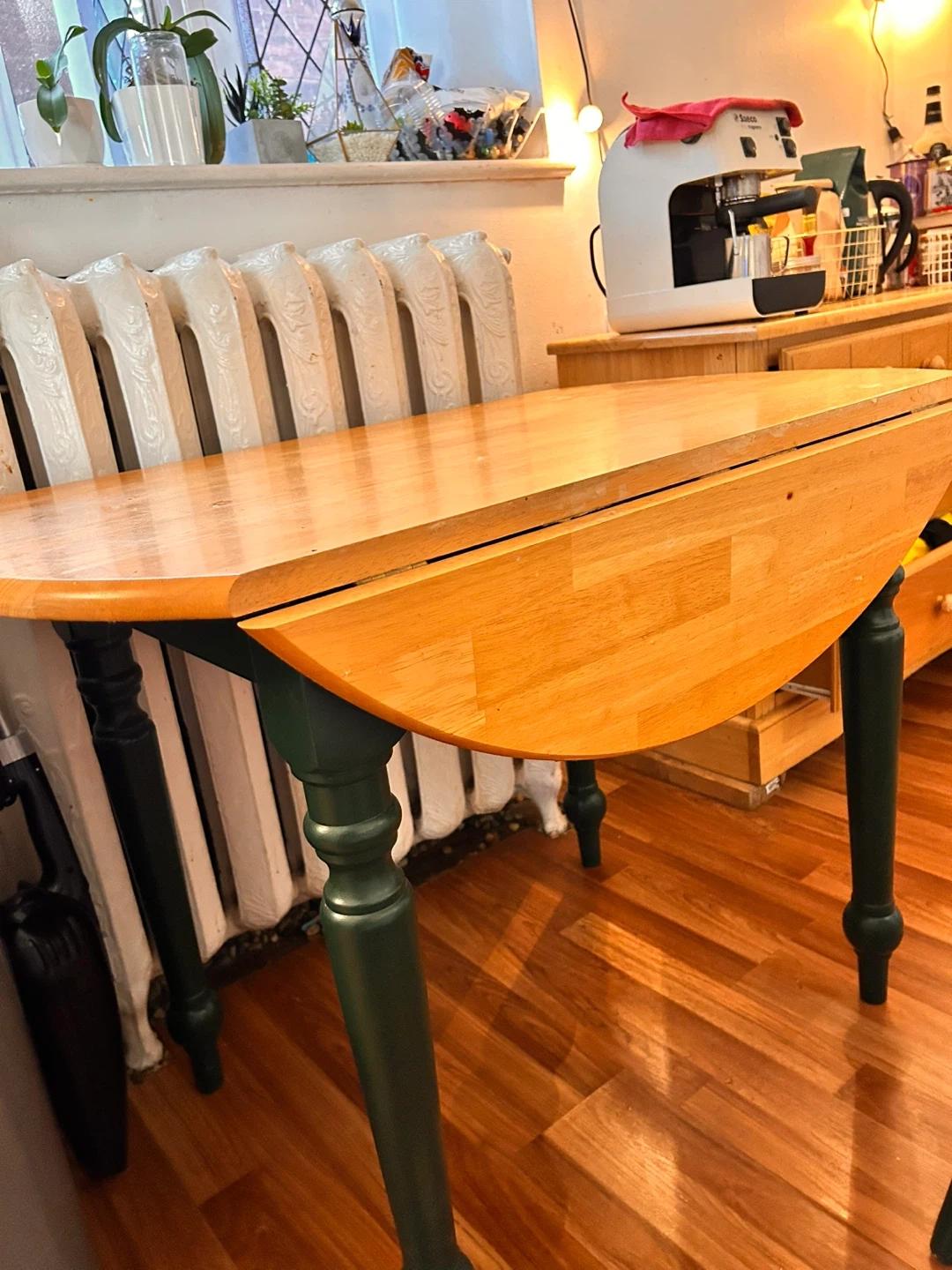 Selling a round drop leaf kitchen table. It's in good condition and would be perfect for a smaller space! It has a light wood top and dark green legs.π¦΅