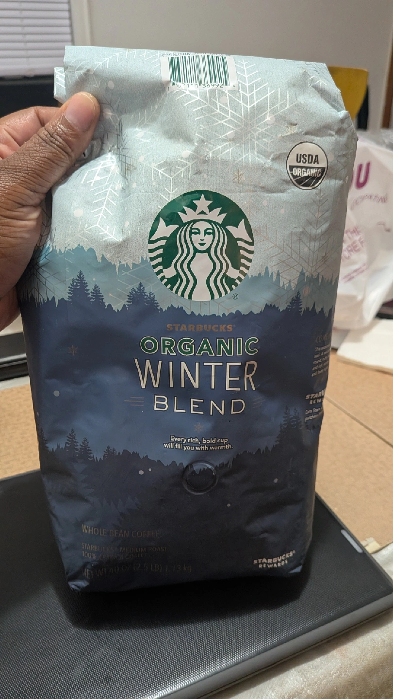 Selling a bag of Starbucks Organic Winter Blend whole bean coffee! It's a Starbucks medium roast. The bag is 40 oz (2.5 lbs) or 1.13 kg. Every rich, bold cup will fill you with warmth. Expired May 2020.