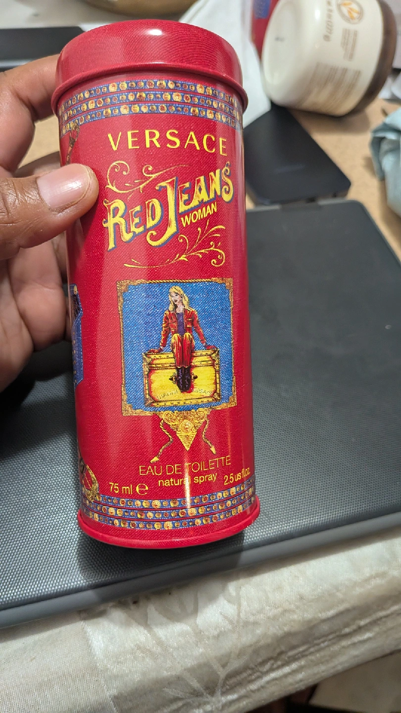 Giving a container that holds a bottle of Versace Red Jeans Woman Eau de Toilette. It's a 75ml natural spray. The tin is in good condition! Please Note: This is an empty can that the perfume comes in. This is a free tin. Good for holding random items.