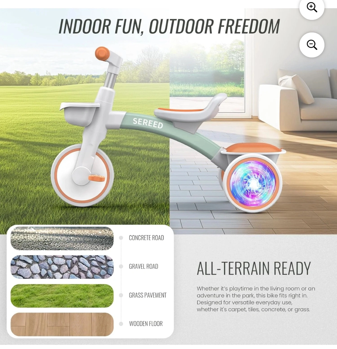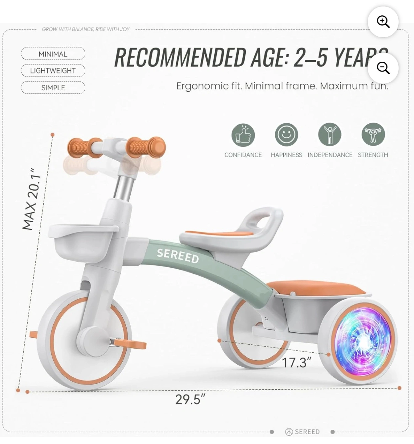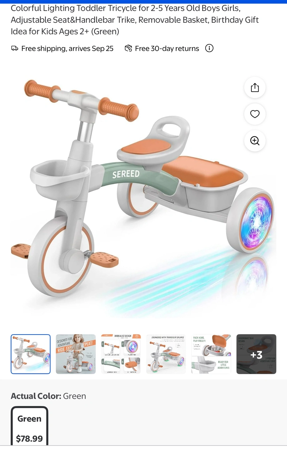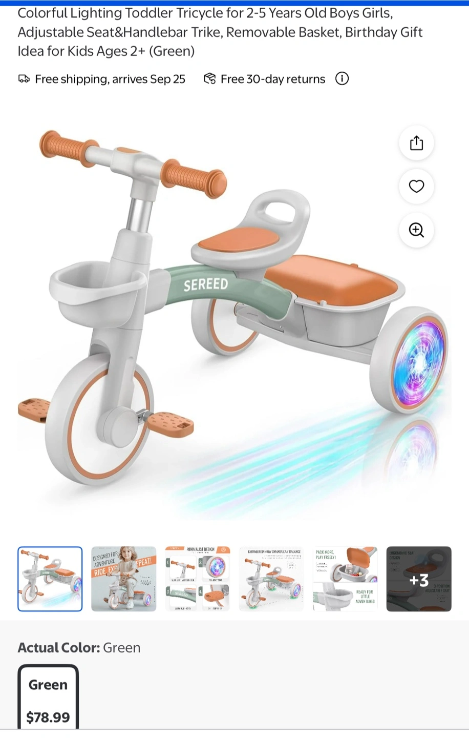 This is a Sereed toddler tricycle designed for children aged 2-5 years old. It features a colorful lighting design and an adjustable seat and handlebar. The tricycle also includes a removable basket, making it a great birthday gift idea for kids. It has a minimalist design with a stylish and functional aluminum frame, soft grip for easy control, EVA foam tires, and anti-slip pedals. Originally bought for $78.99