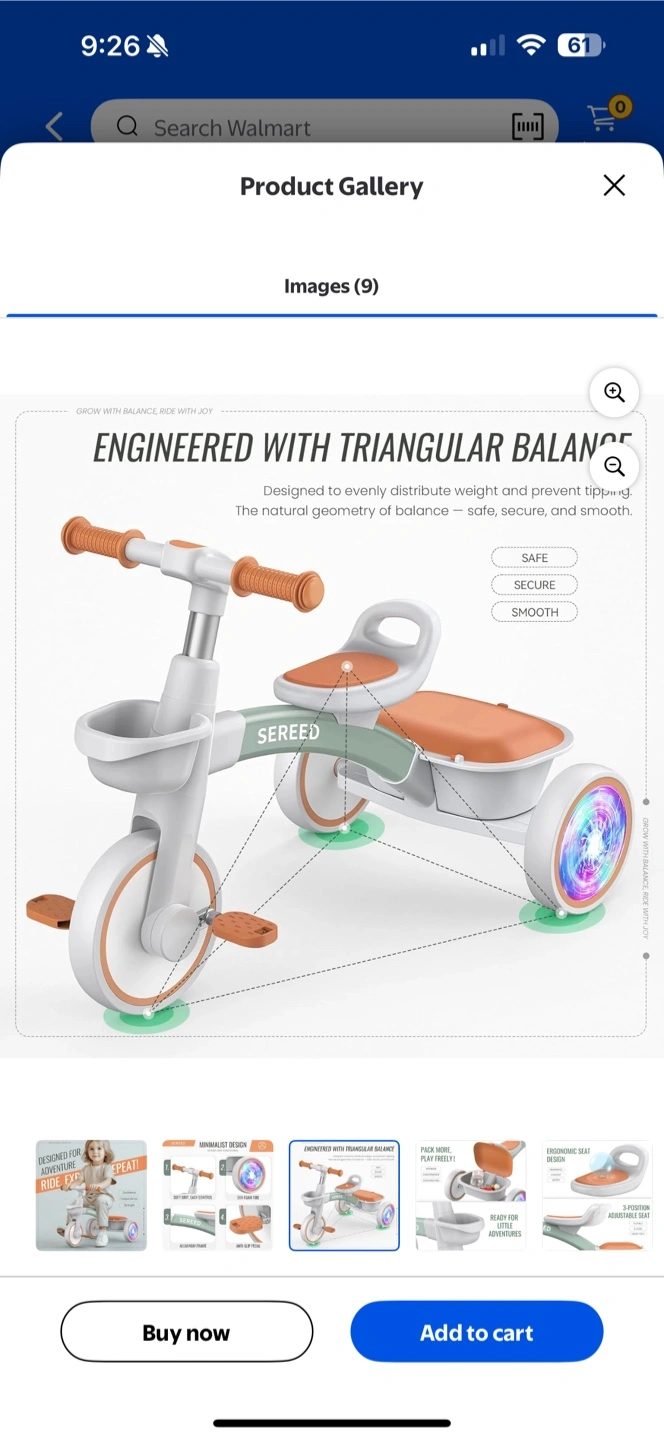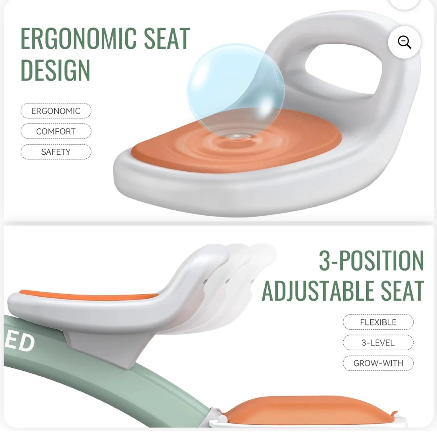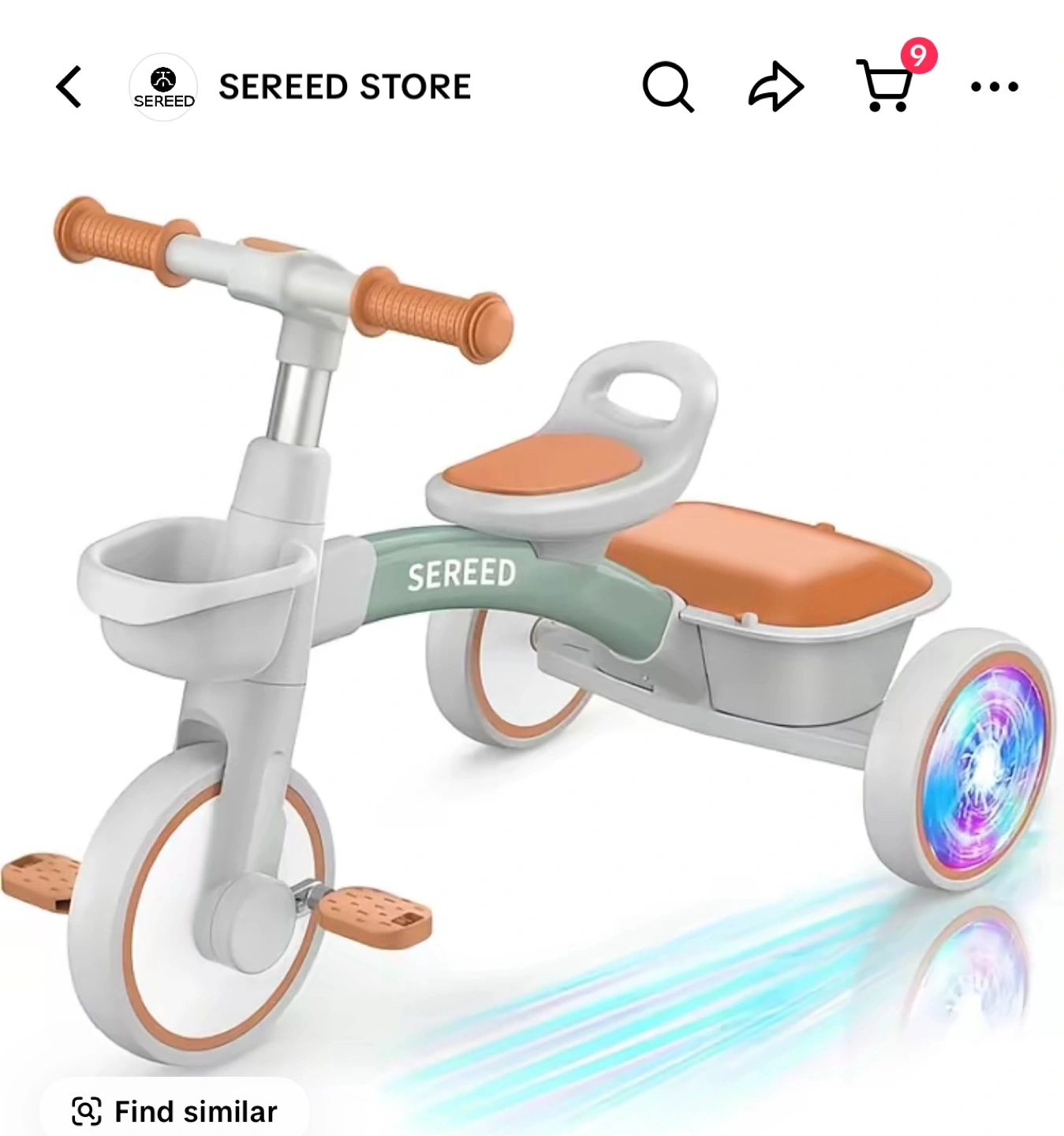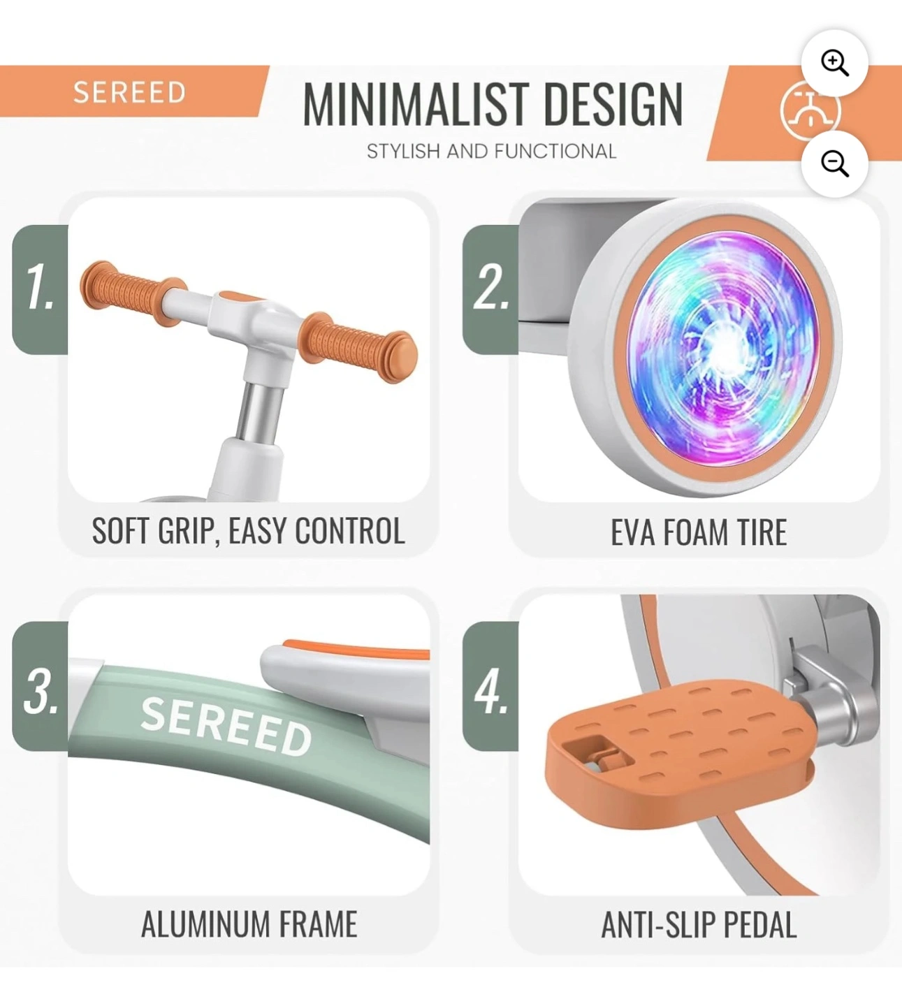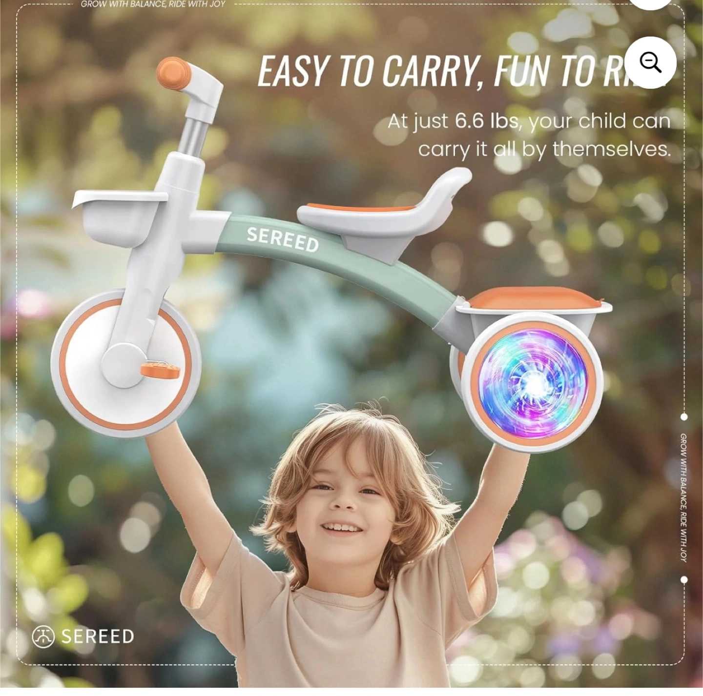 This is a Sereed toddler tricycle designed for children aged 2-5 years old. It features a colorful lighting design and an adjustable seat and handlebar. The tricycle also includes a removable basket, making it a great birthday gift idea for kids. It has a minimalist design with a stylish and functional aluminum frame, soft grip for easy control, EVA foam tires, and anti-slip pedals. Originally bought for $78.99