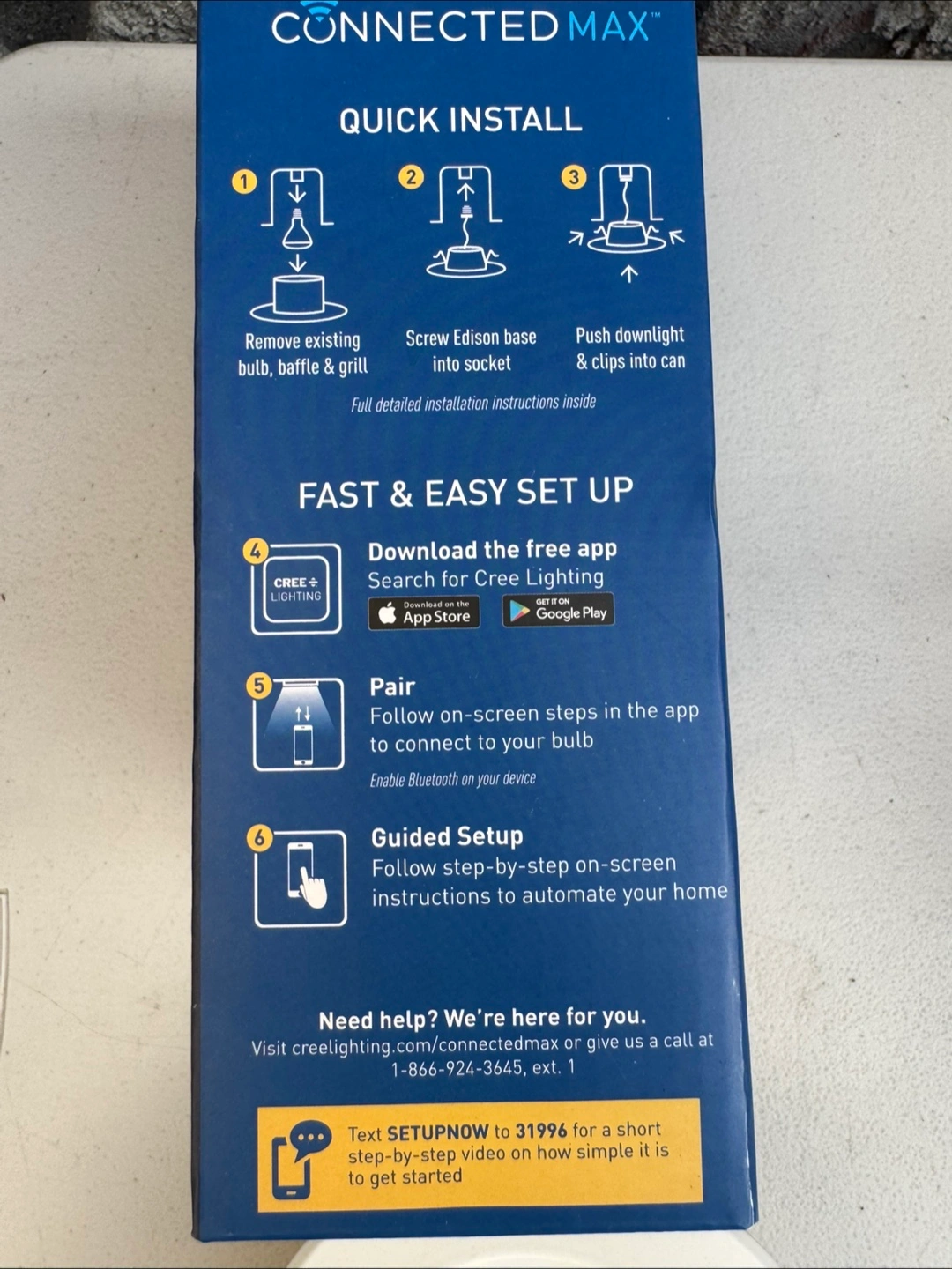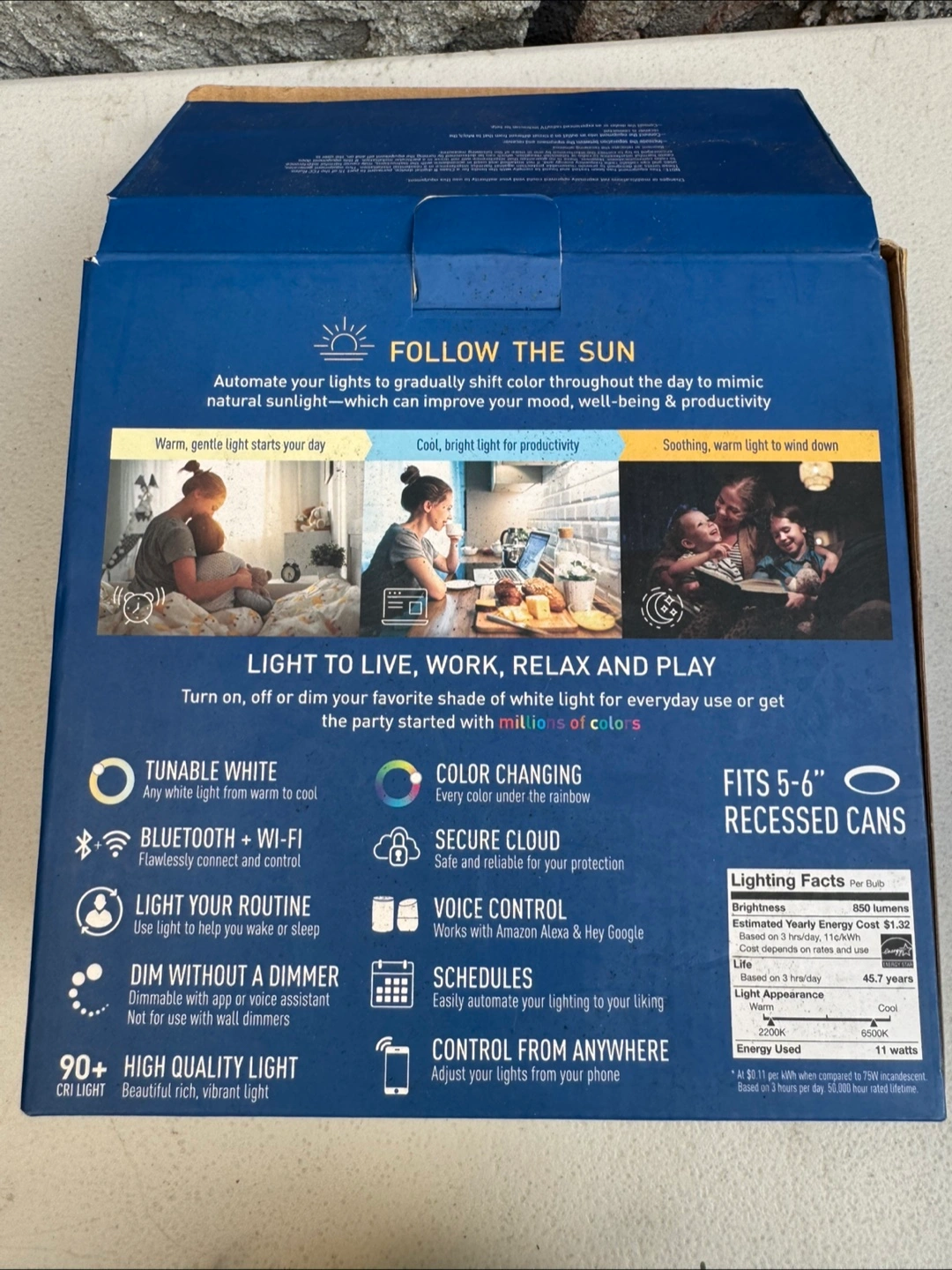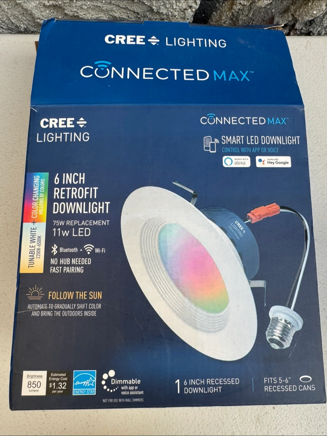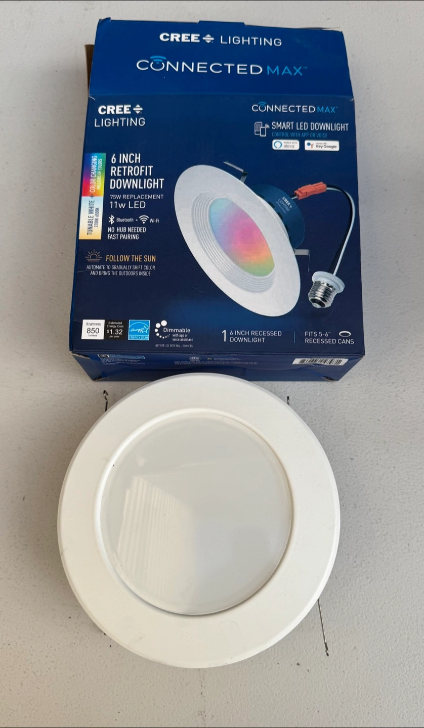 89I'm selling a Cree Lighting Connected Max 6-inch Retrofit Downlight. This smart LED downlight is compatible with Alexa and Google Assistant. It's a 75W replacement, but only uses 11W LED. It features Bluetooth and Wi-Fi connectivity for easy pairing. The light is dimmable and color changing, allowing you to automate the color to shift throughout the day. It is designed to fit 5-6" recessed cans.