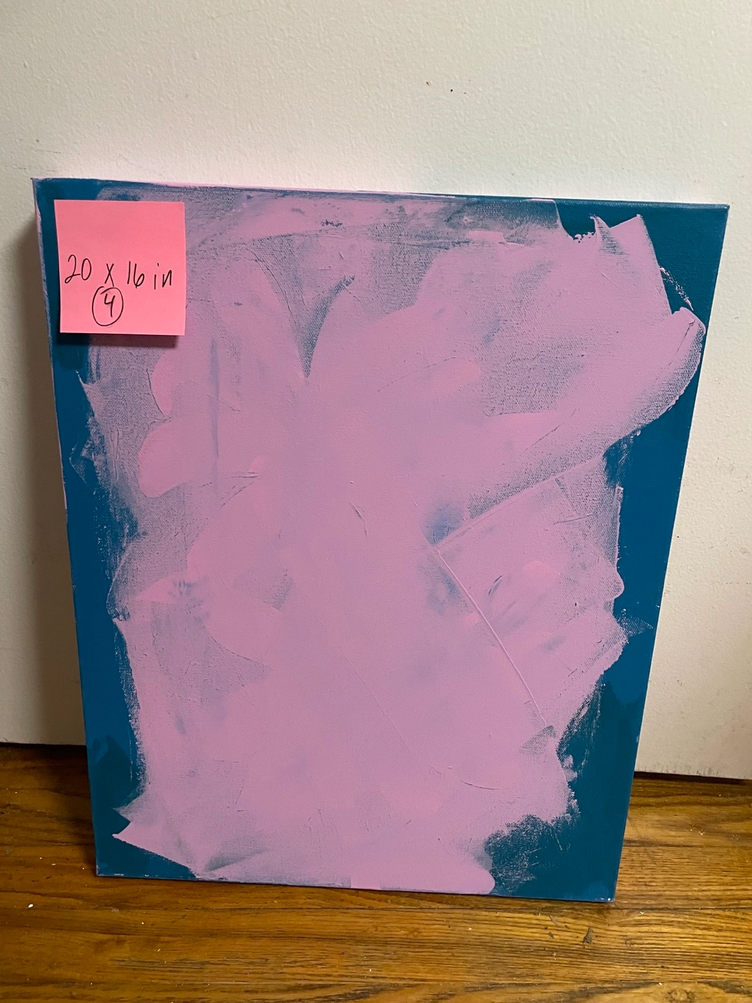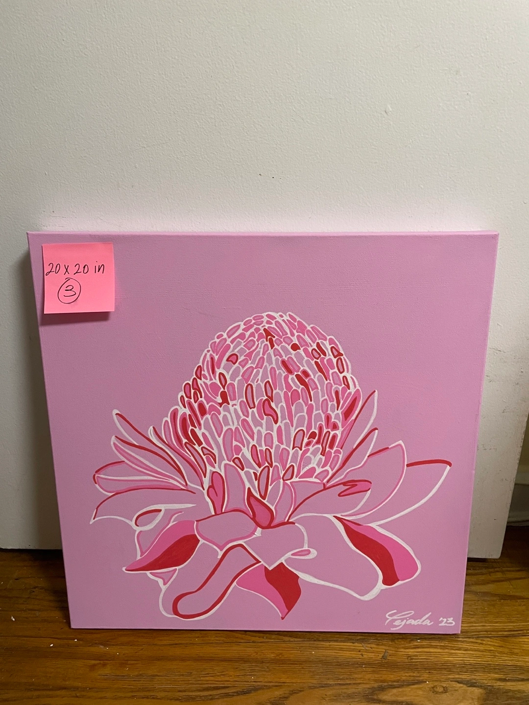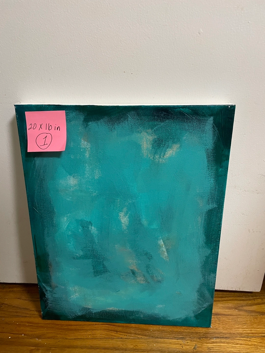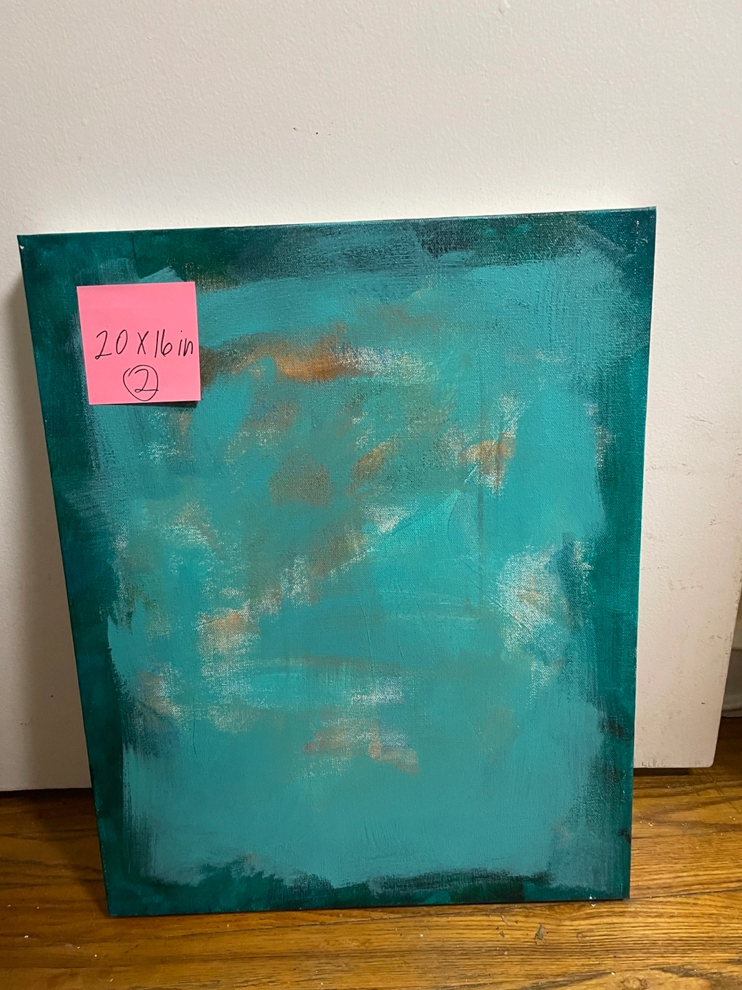I have several handmade paintings for sale. They come in various sizes, including 20x16 inches and 20x20 inches.