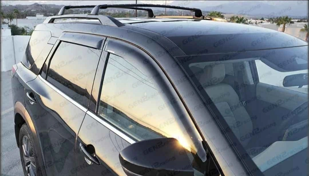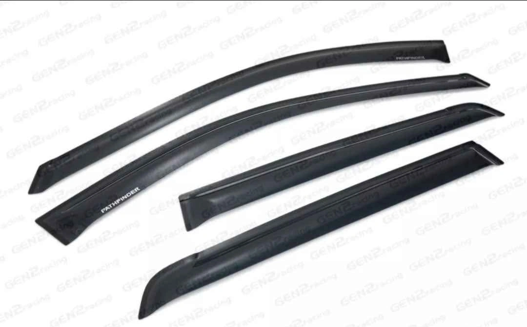 Material: Acrylic Thickness: 3 mm Finish: Dark tinted Style: Out-channel/tape-on Install: 3M auto grade 2-sided tape Quantity: set of 4 for front and rear windows