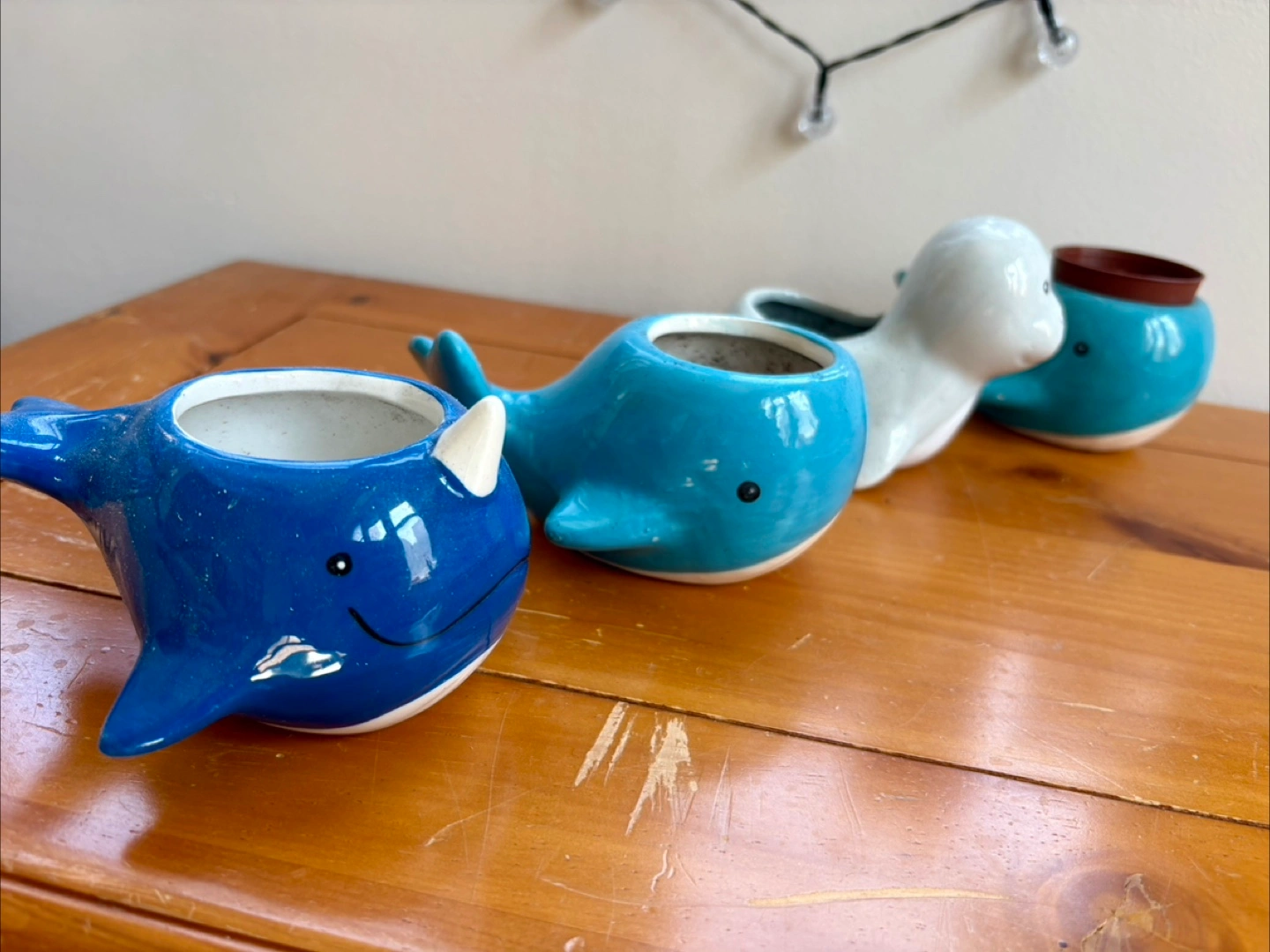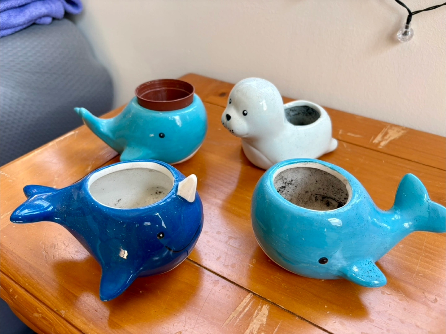 26I'm selling four adorable animal-shaped planters! They're mini. The starter planters fit in these. The set includes a narwhal, two whales, and a seal. Perfect for small succulents or starting seeds $5 each or all 4 for $15!