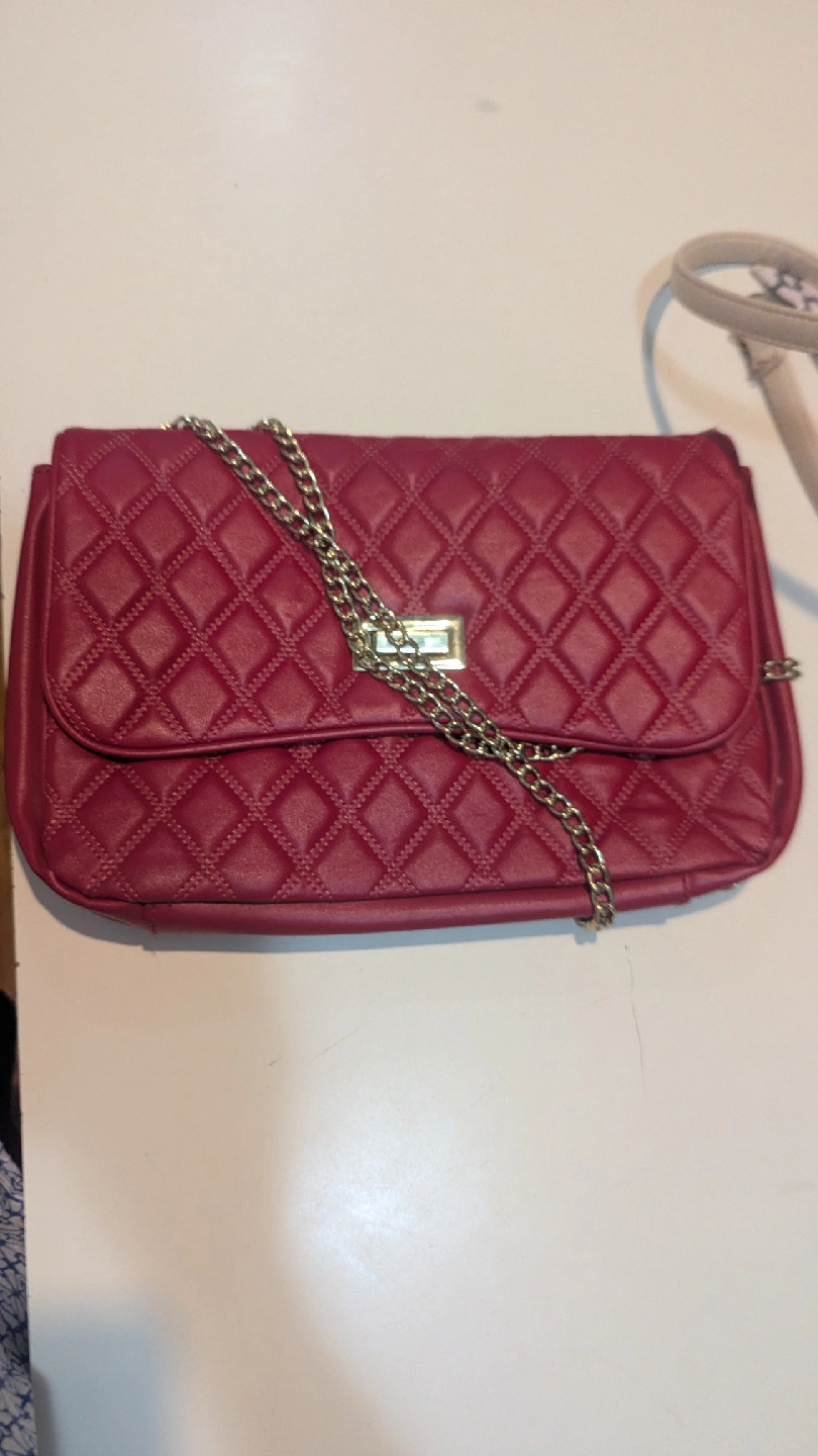 This is a red quilted bag with a gold hardware and chain strap! It's in good condition and ready for a new home