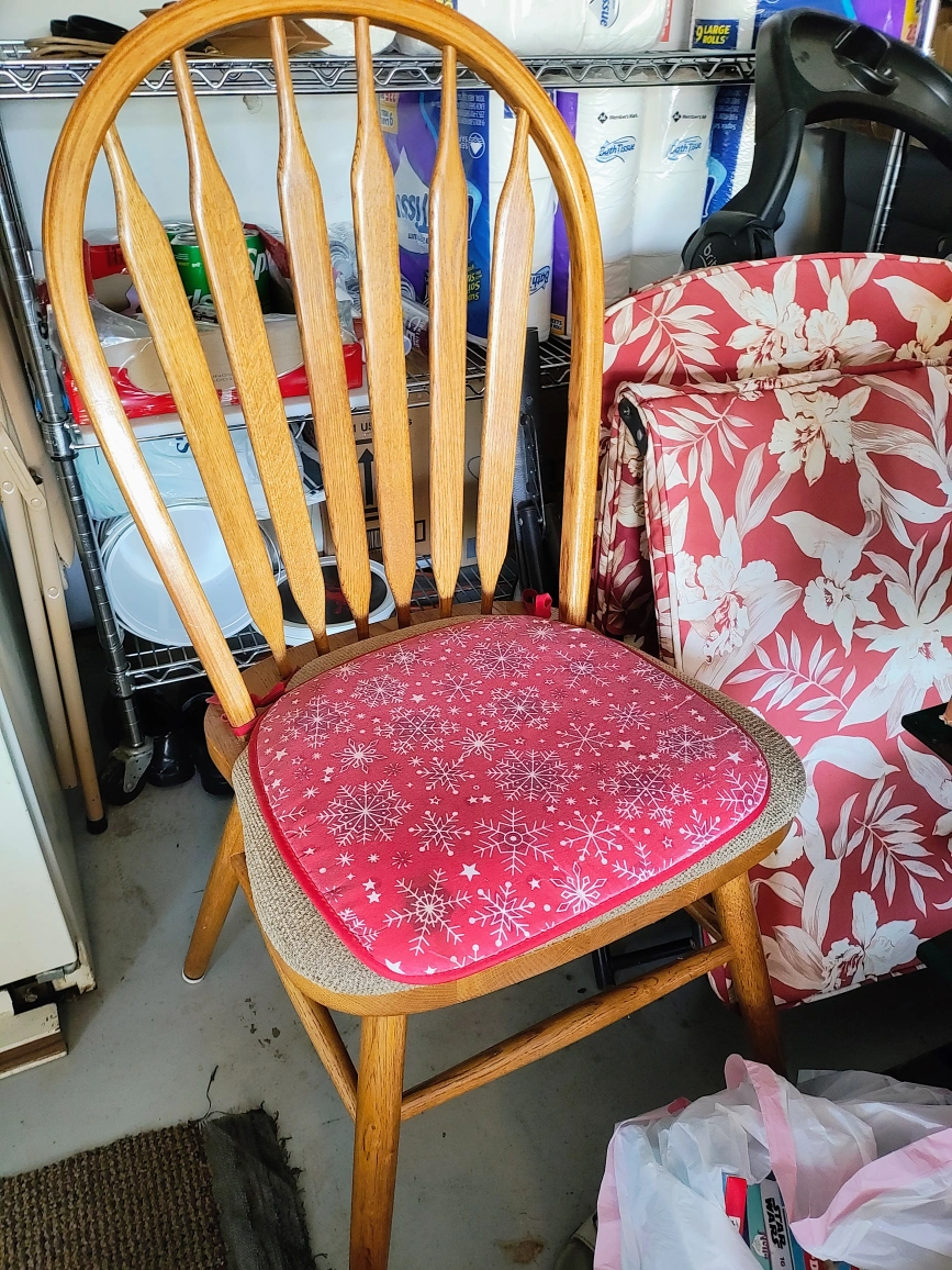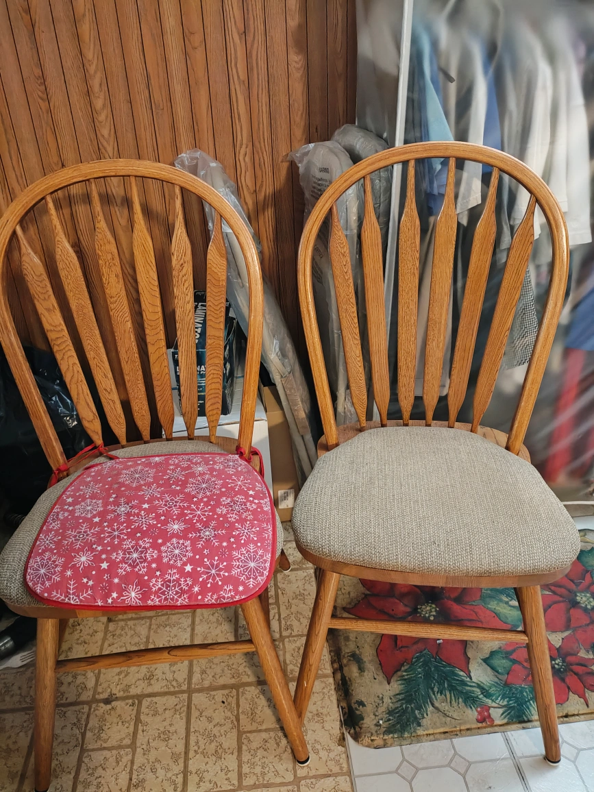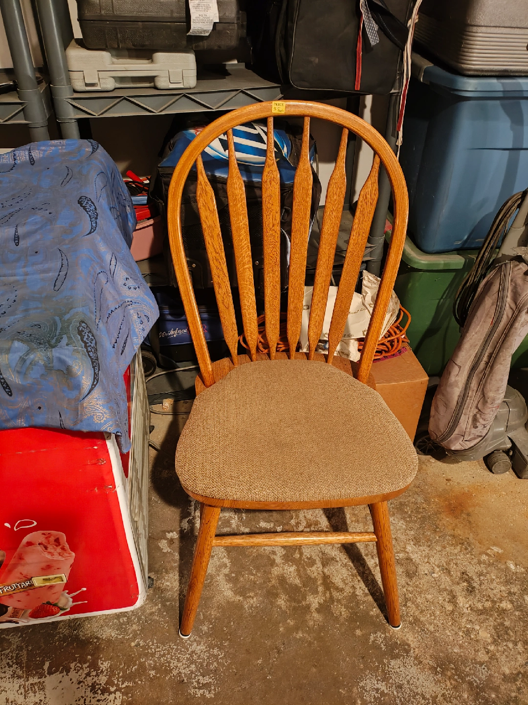 Selling a classic wooden spindle back dining chair. It has a comfortable, neutral-colored seat and a sturdy frame. Perfect for adding a touch of traditional charm to your dining area or kitchen! 5 chairs total. all for $25.
