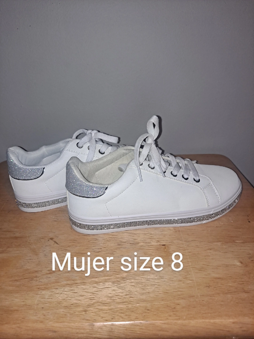 10Selling a pair of Mujer white sneakers in size 8. They have a cute glittery accent on the back and a rhinestone detail around the sole. Perfect for adding a little sparkle to your everyday look!