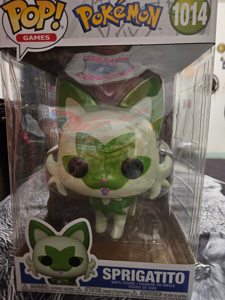 Selling a Funko Pop! Games figure of Sprigatito from Pokémon, number 1014. It's in its original box and appears to be in great condition. The box measures approximately 6 inches wide and 9 inches tall