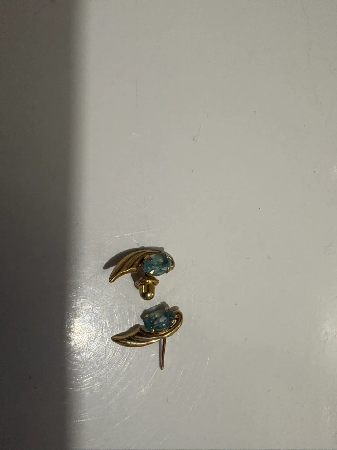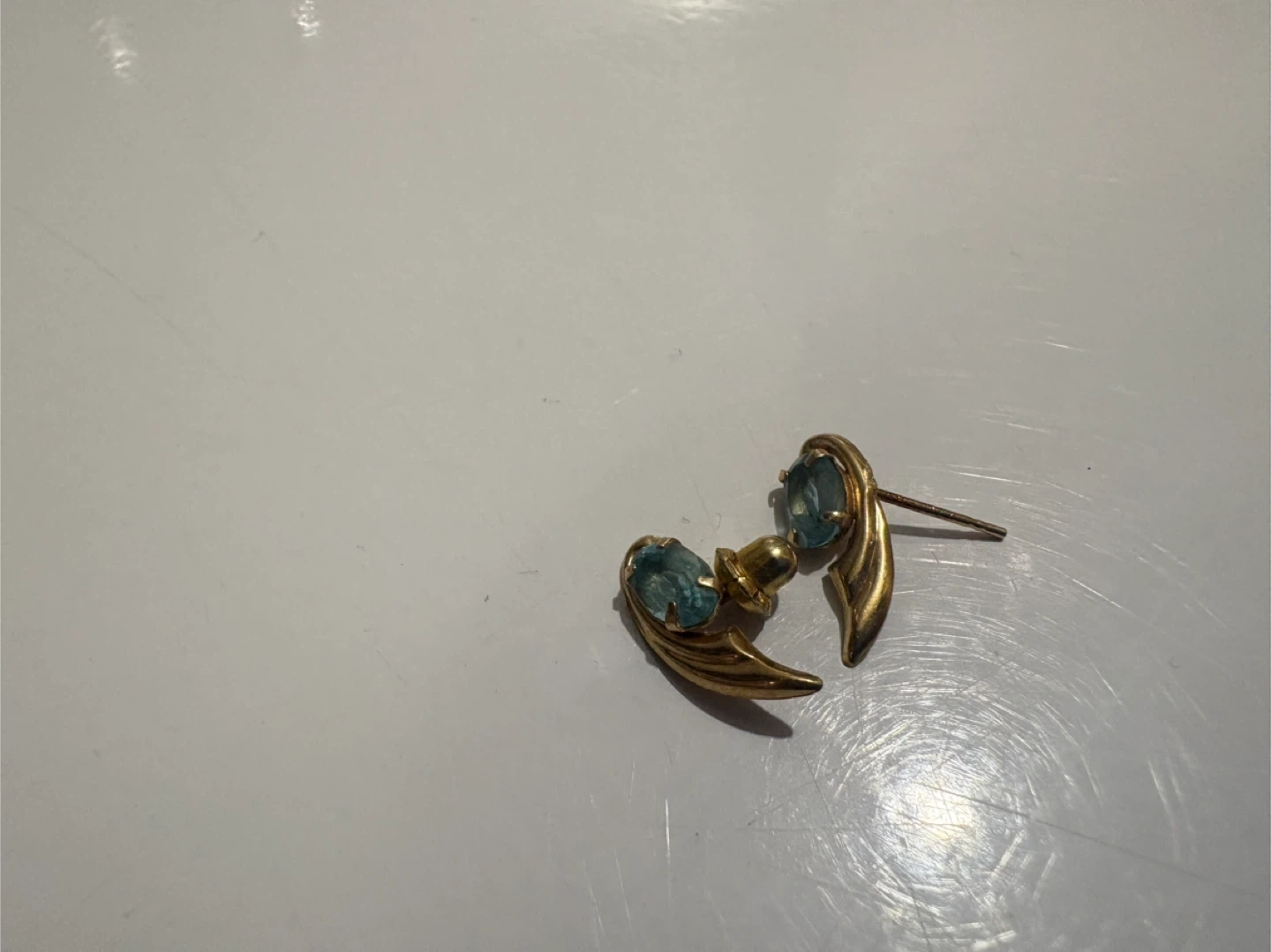 65Selling a pair of vintage gold-tone earrings with blue stones! They are in good condition and ready for a new home 1 back missing