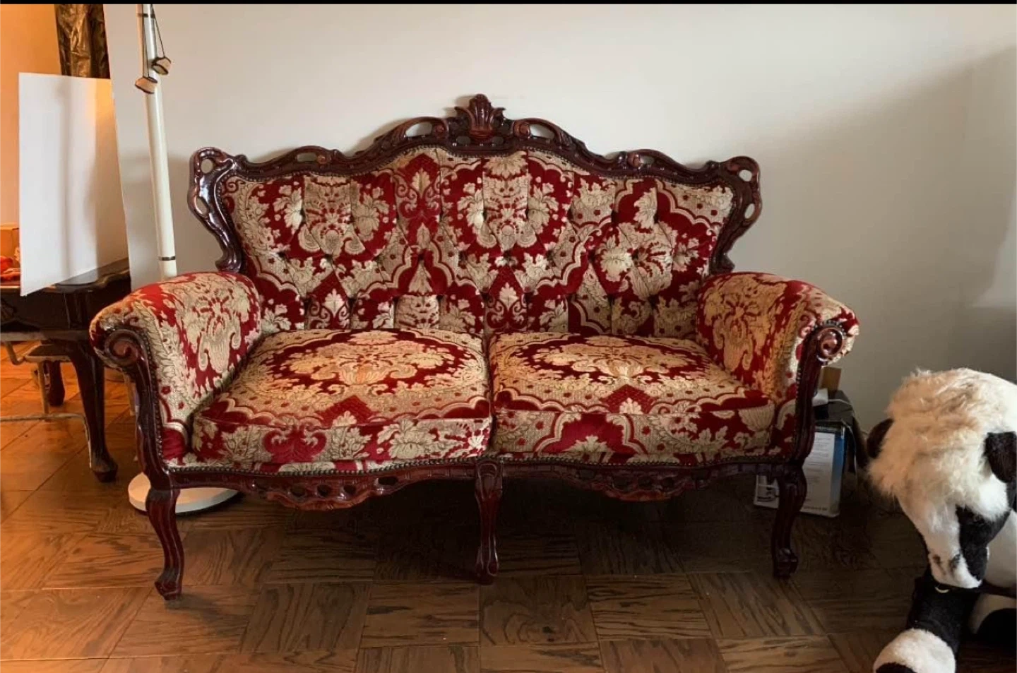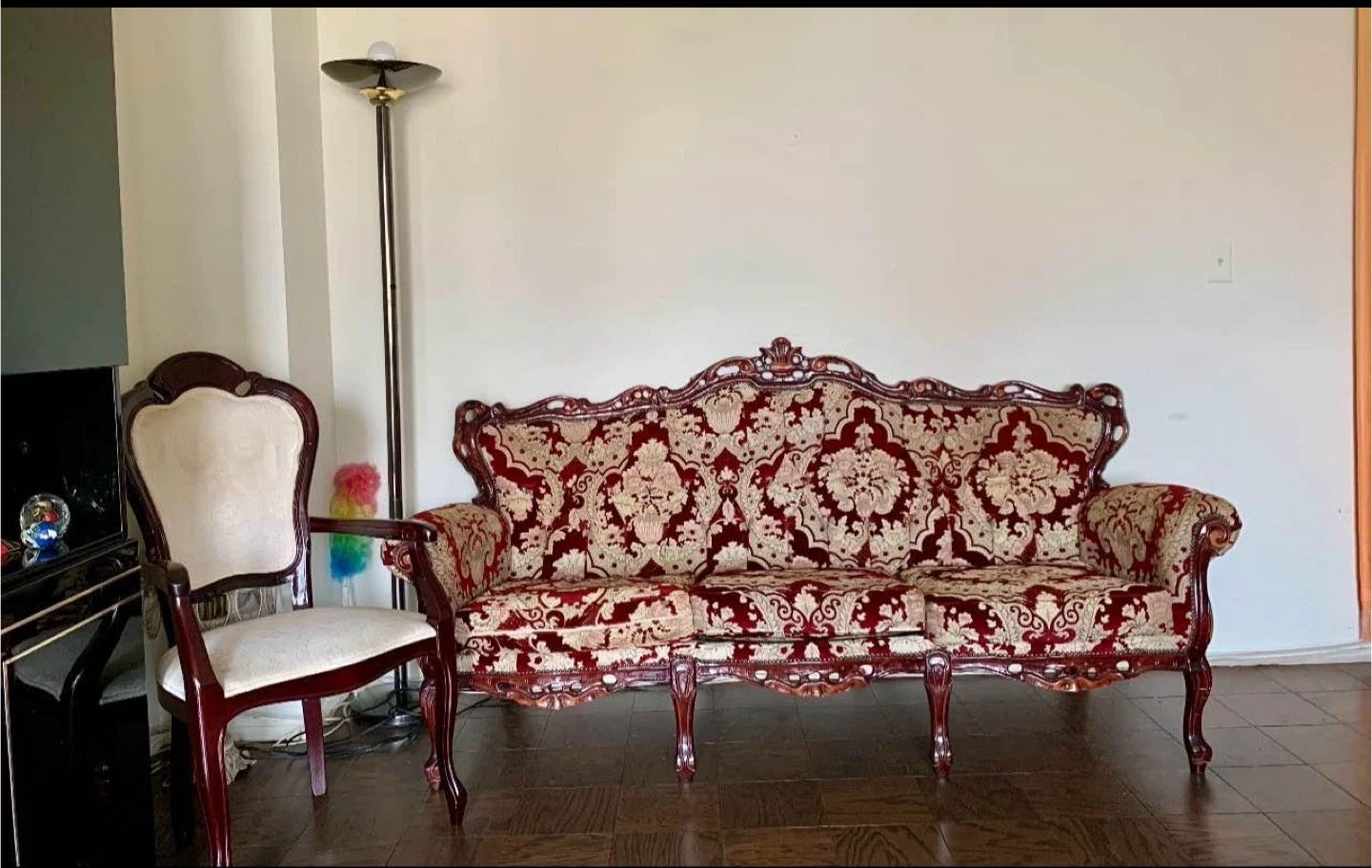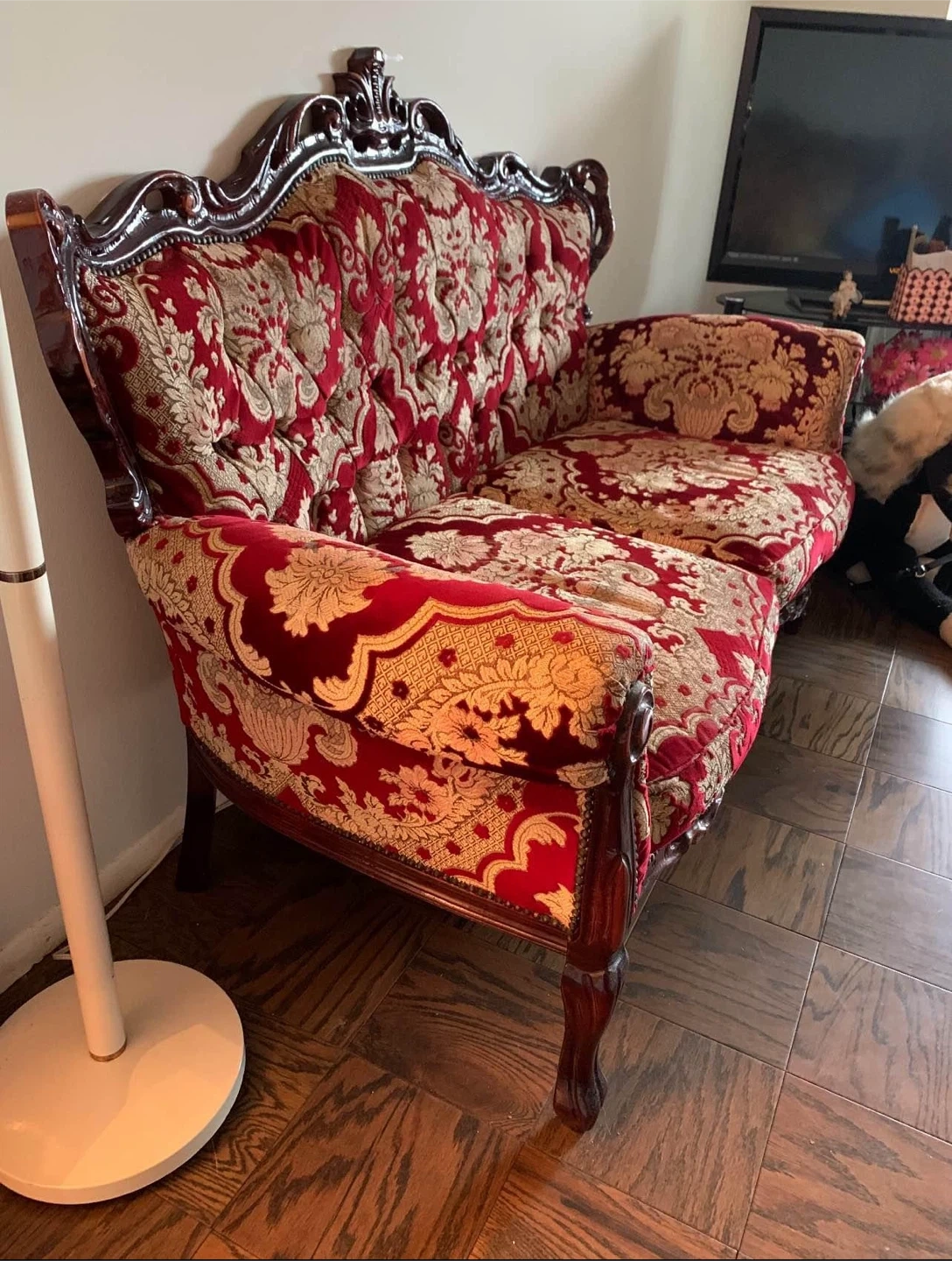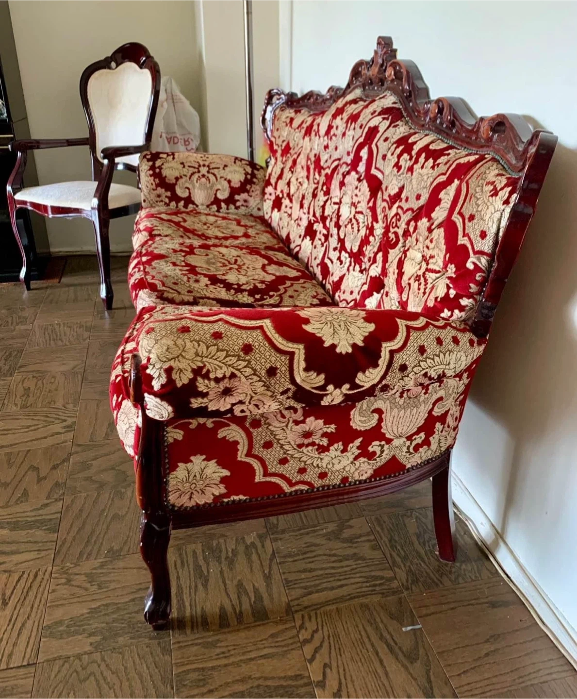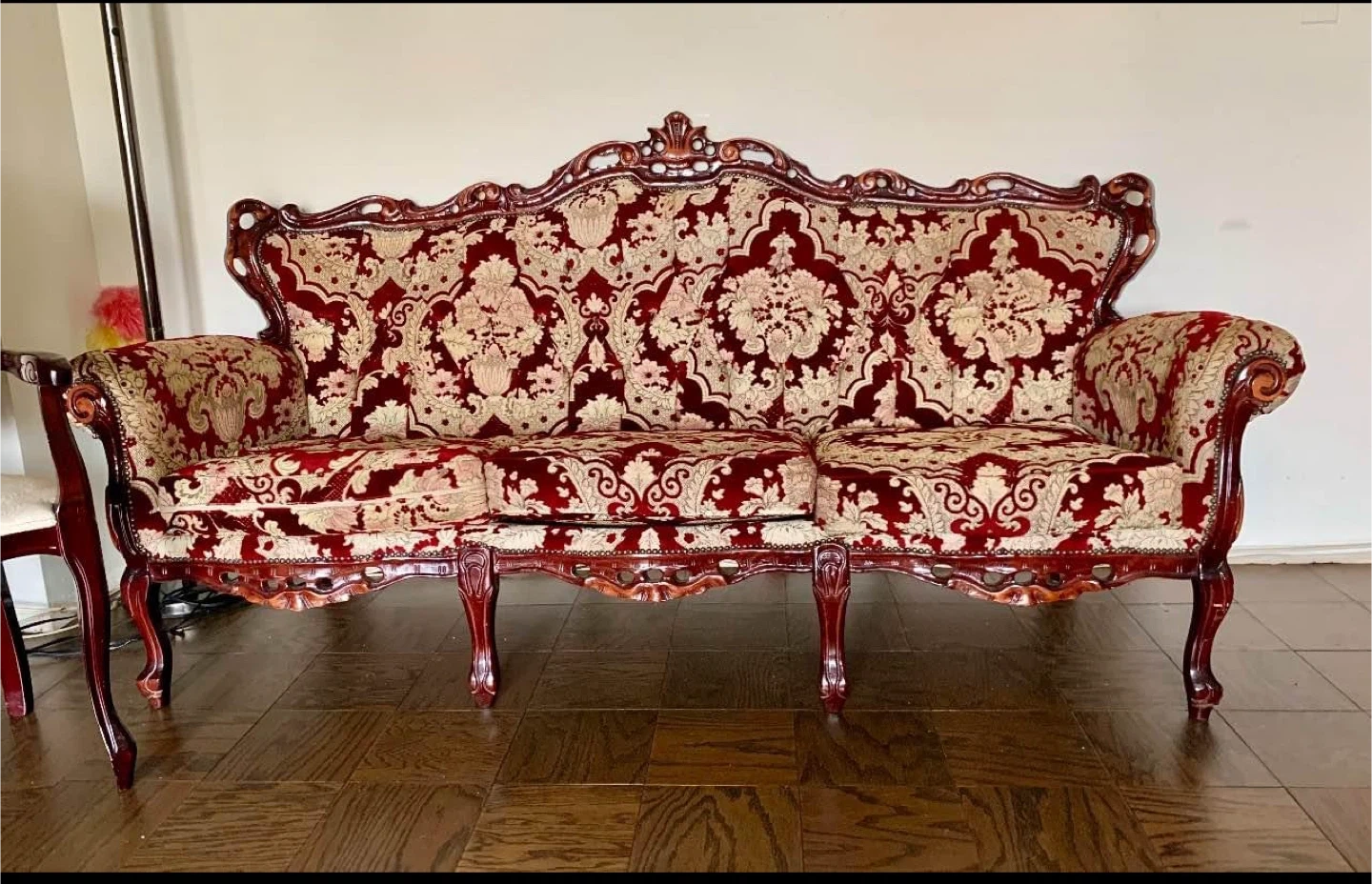 32Selling a vintage-style sofa with a beautiful red and gold floral pattern. It's a unique piece that would add character to any living room. The frame is dark wood and the upholstery is in good condition.