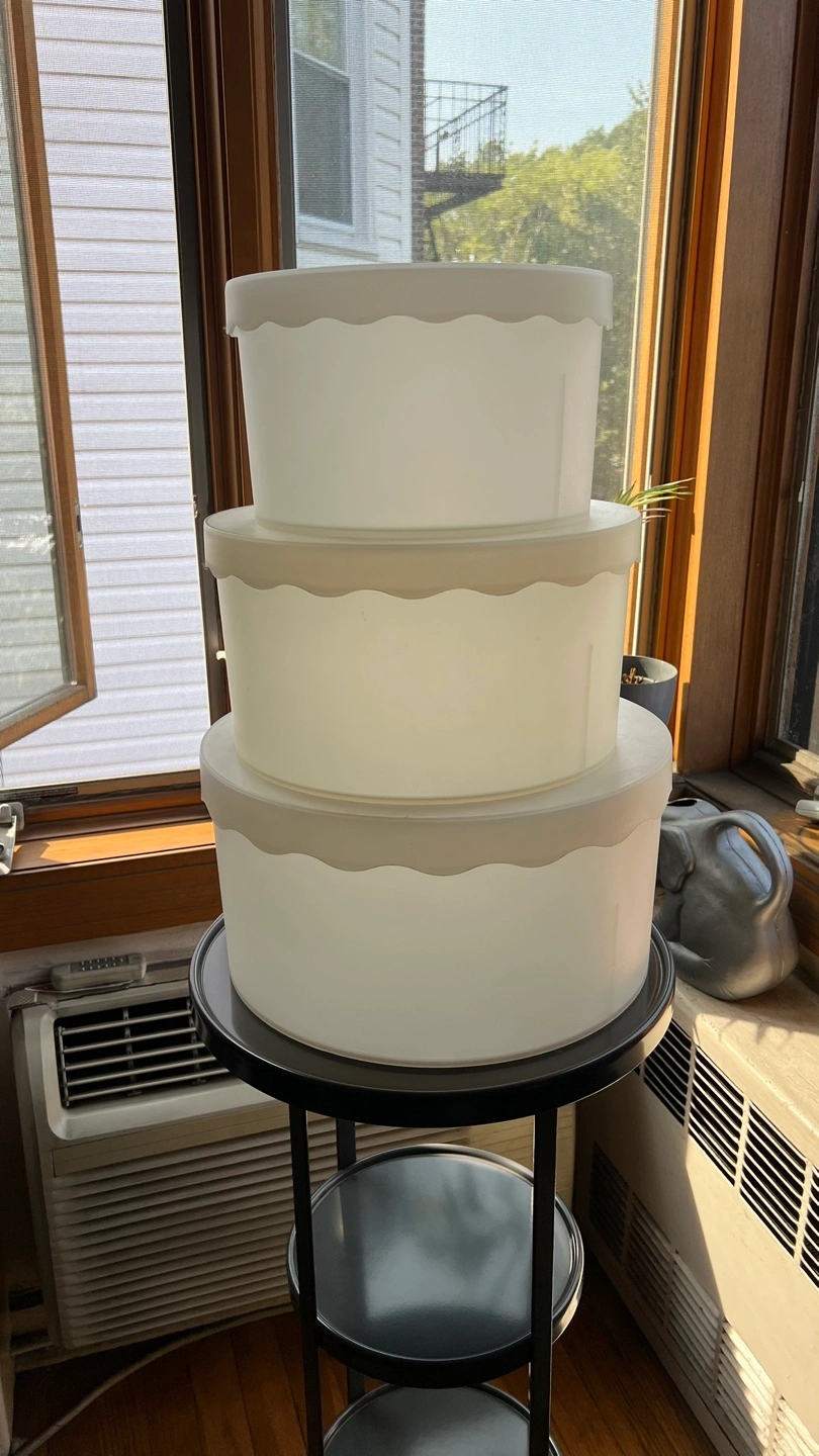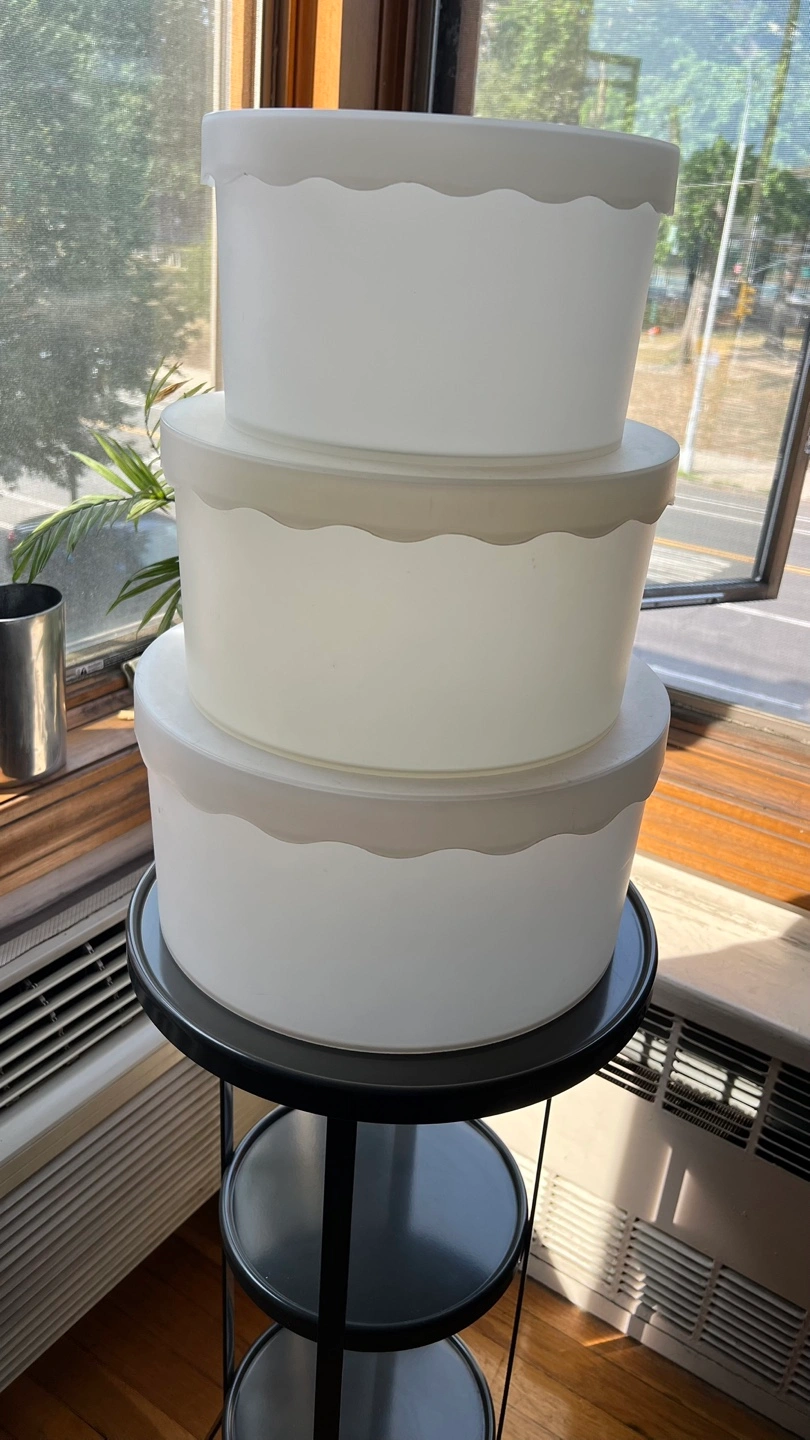 Set of 3 round lidded storage bins with scalloped trim; stackable, or can nest inside one another when not in use.