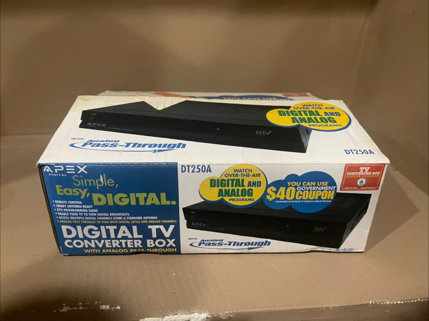 Selling an Apex Digital TV Converter Box with Analog Pass-Through, model DT250A! It's simple, easy to use, and digital. It features a remote control, is smart antenna-ready, and has a DTV programming guide. You can enable your TV to view digital broadcasts and access multiple digital channels using a standard antenna. Also features analog pass-through to view both digital (ATSC) and analog channels