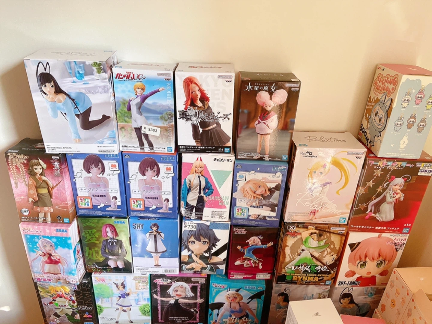 Selling a collection of anime figures, including figures from Mobile Suit Gundam UC, Chainsaw Man, and Spy x Family. All figures are in their original boxes. Perfect for any anime collector!