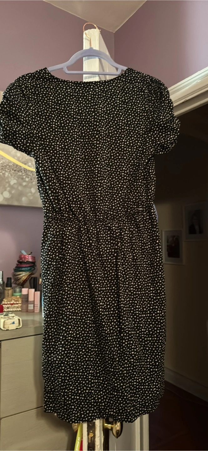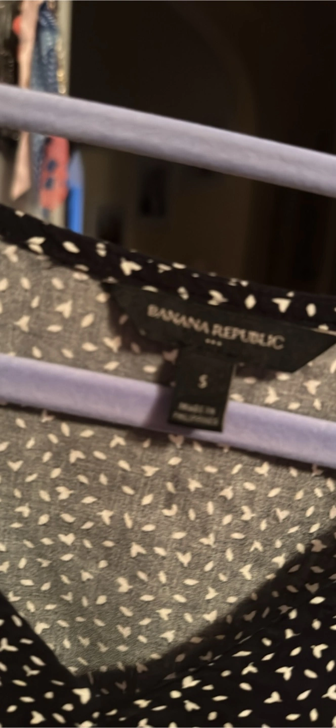 Here's a cute Banana Republic dress! It features a black and white pattern and is a size small. Perfect for any occasion!