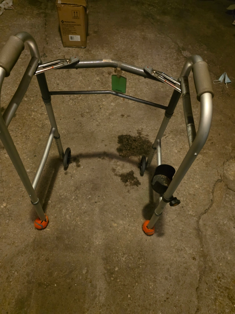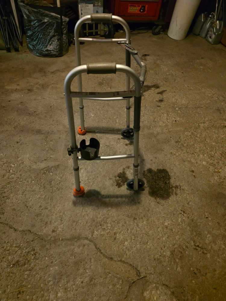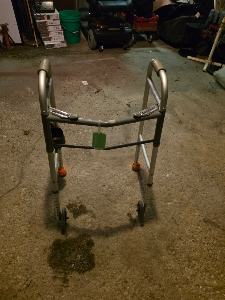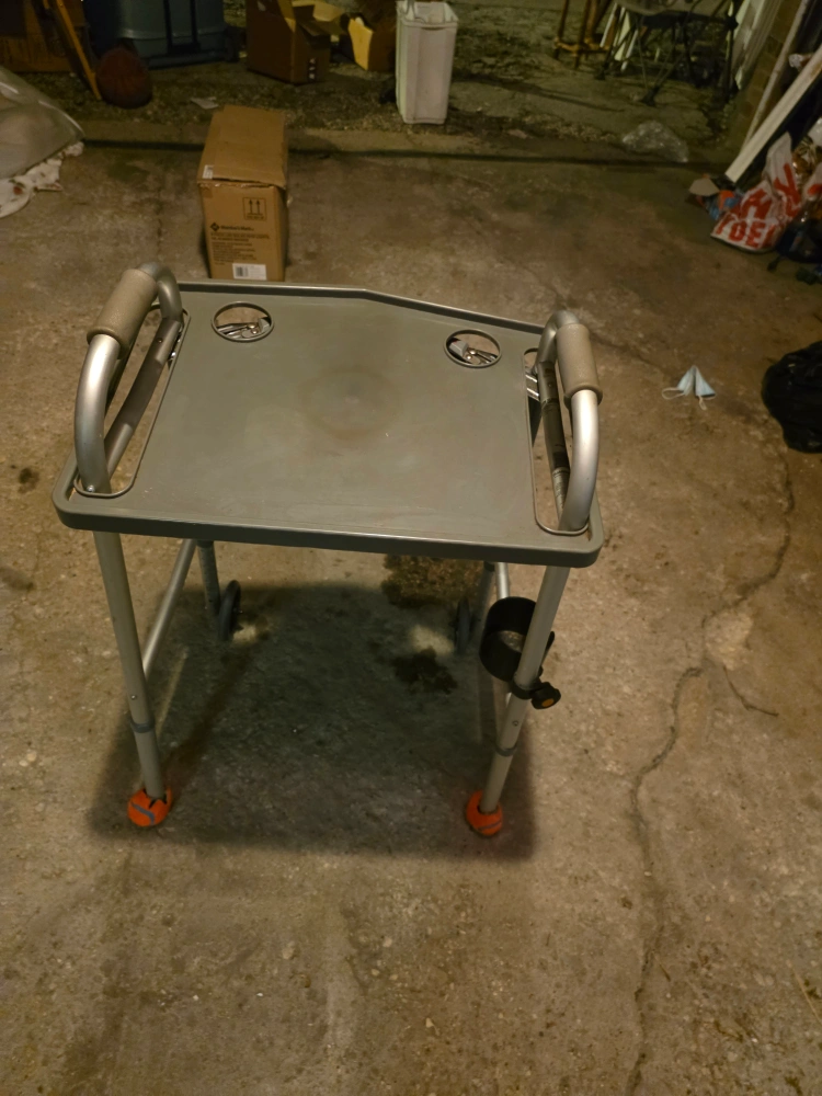 Selling a used rolling walker. It has a tray, cup holder and wheels for easy mobility. Height is adjustable. Folds for easy storage. It is in good condition.