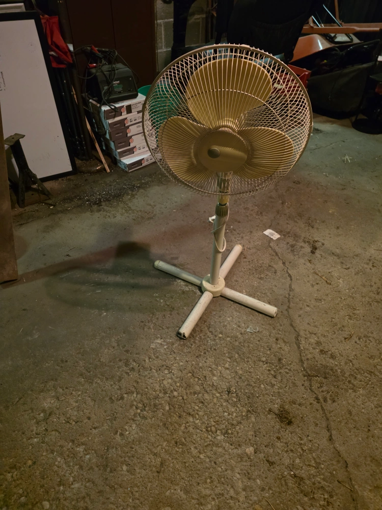 Selling a standing fan. It's in used condition and has a yellowed color. Perfect for keeping cool during the summer months! 3 speed and oscillates. works well.