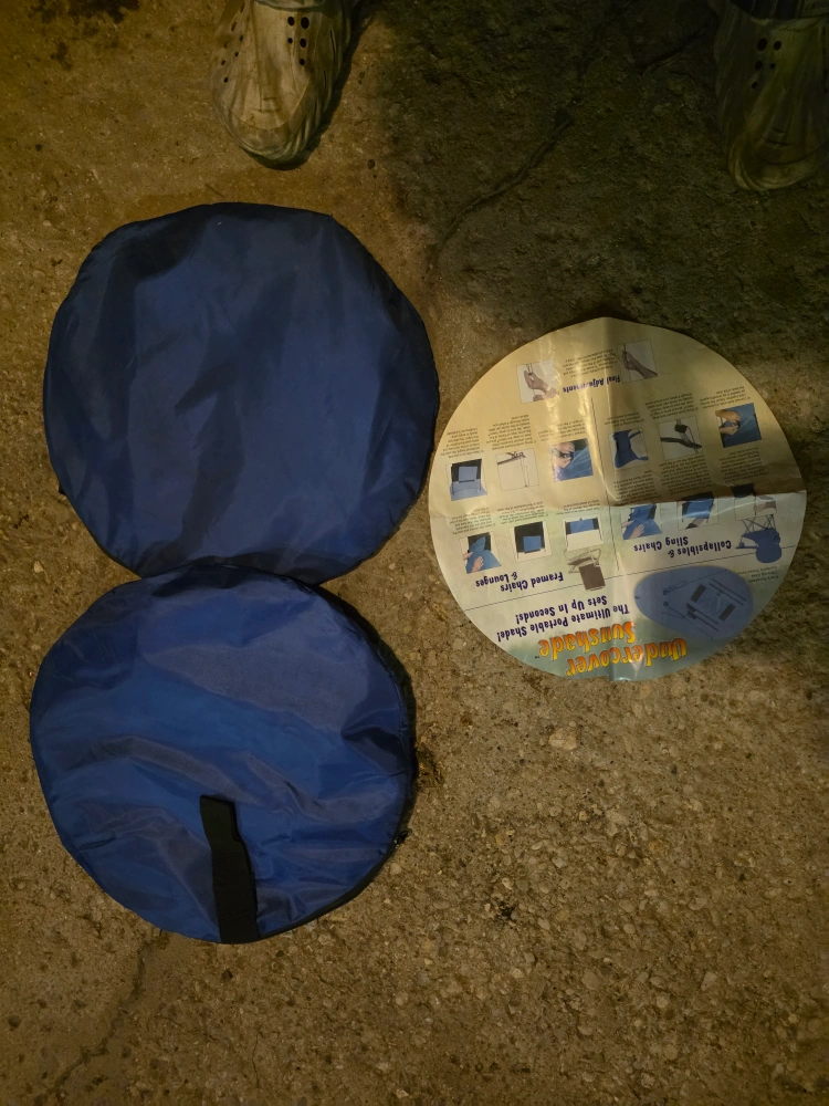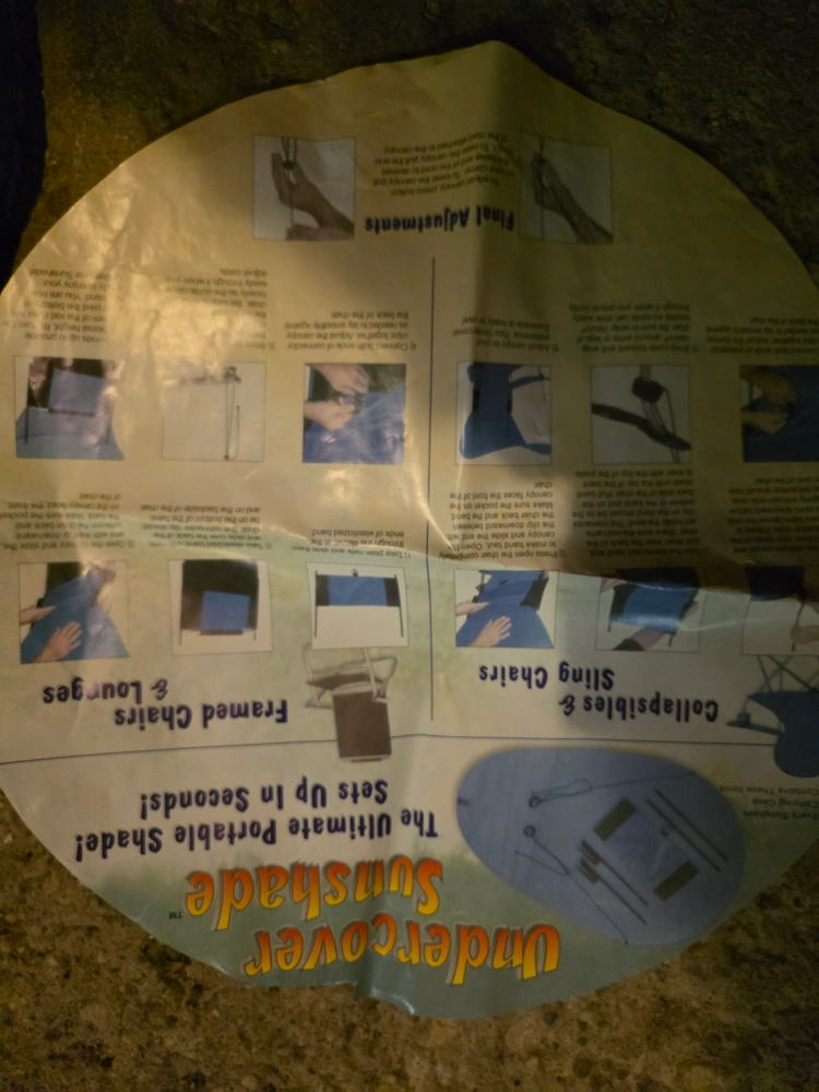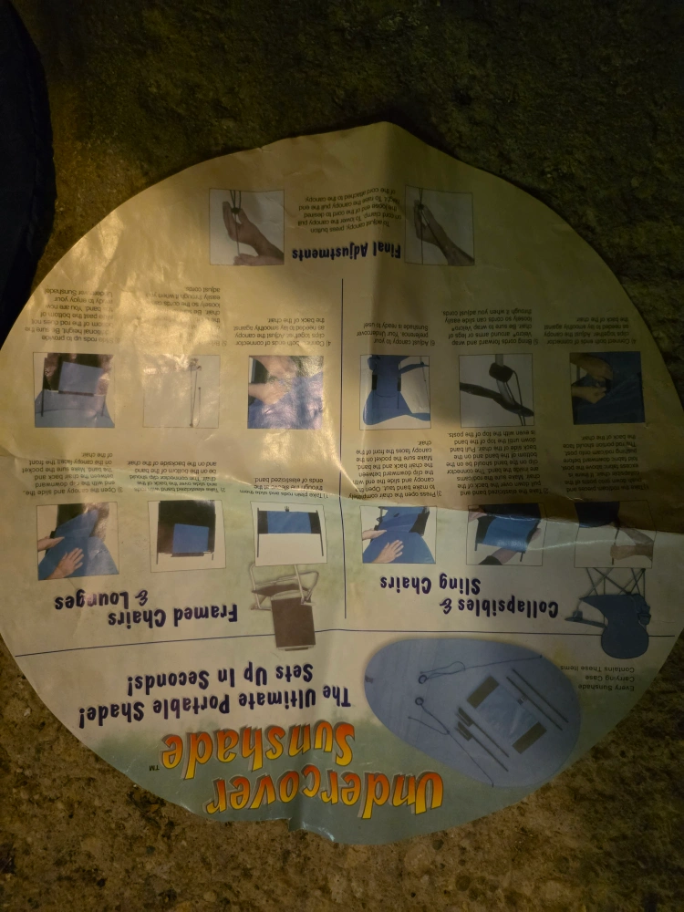 This is a portable sunshade. It sets up in seconds! It's the ultimate shade for collapsible and sling chairs, framed chairs, and lounges. Comes in carrying case. 2 shades.