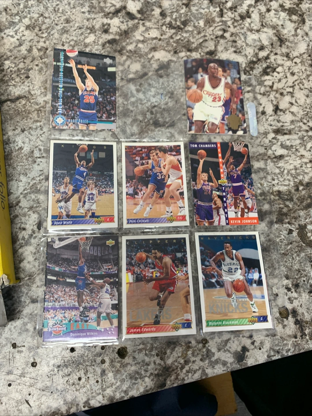 Selling a collection of vintage basketball trading cards. You'll find players like Mark Price, Spud Webb, Tom Chambers, Kevin Johnson, Dominique Wilkins, James Edwards, and Rolando Blackman. Great for any basketball card collector!