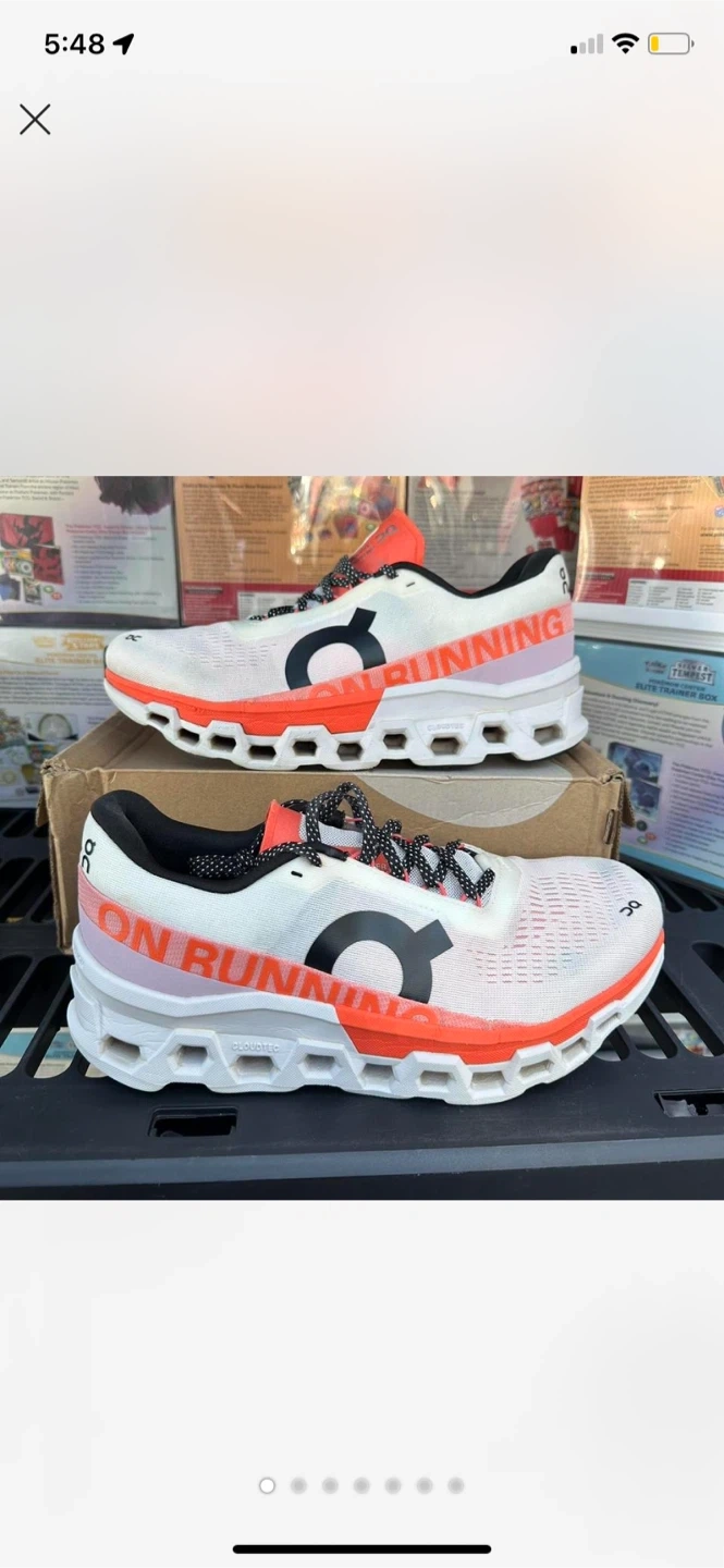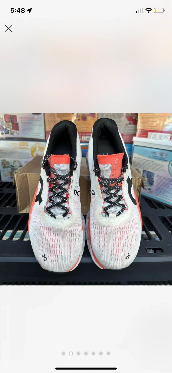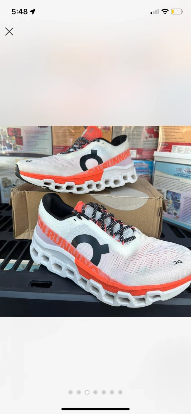 Selling a pair of On Running Cloudmonster sneakers. They are white with orange accents and have a unique sole design. They show some signs of wear, particularly on the soles, but are still in good condition for running or everyday wear. Great condition willing to negotiate price .