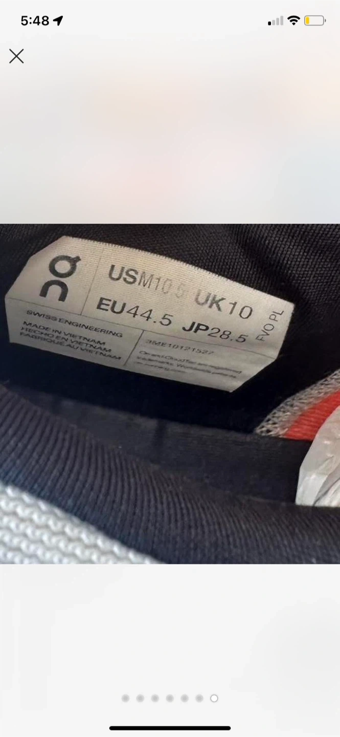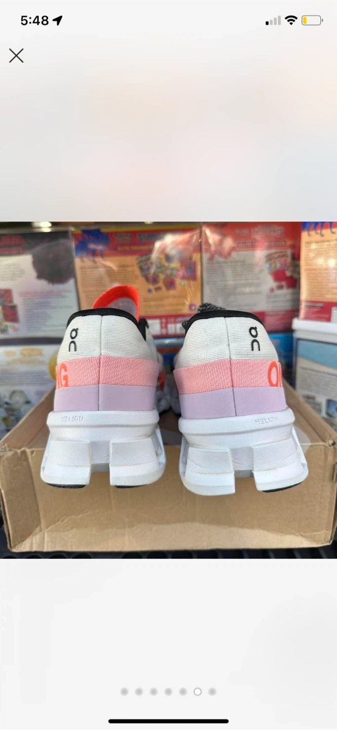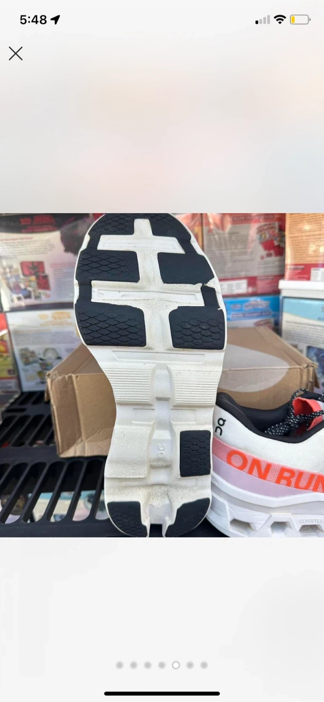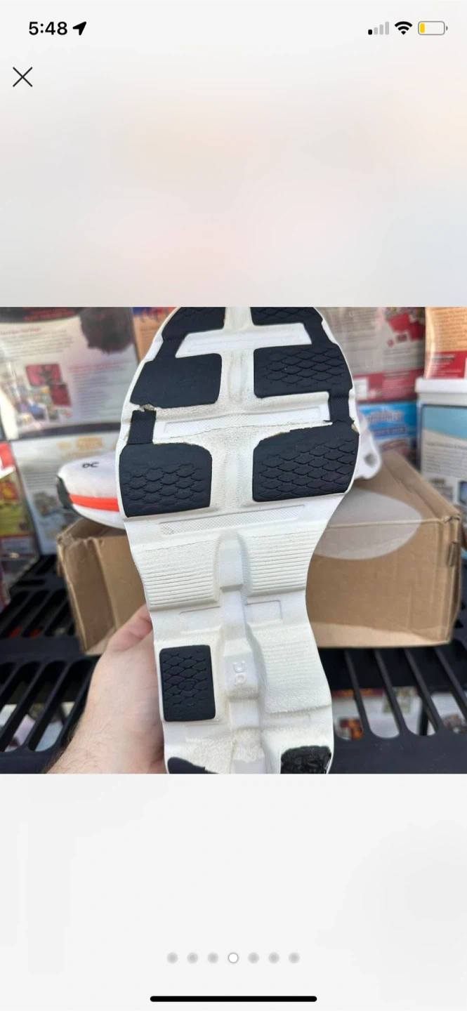 Selling a pair of On Running Cloudmonster sneakers. They are white with orange accents and have a unique sole design. They show some signs of wear, particularly on the soles, but are still in good condition for running or everyday wear. Great condition willing to negotiate price .