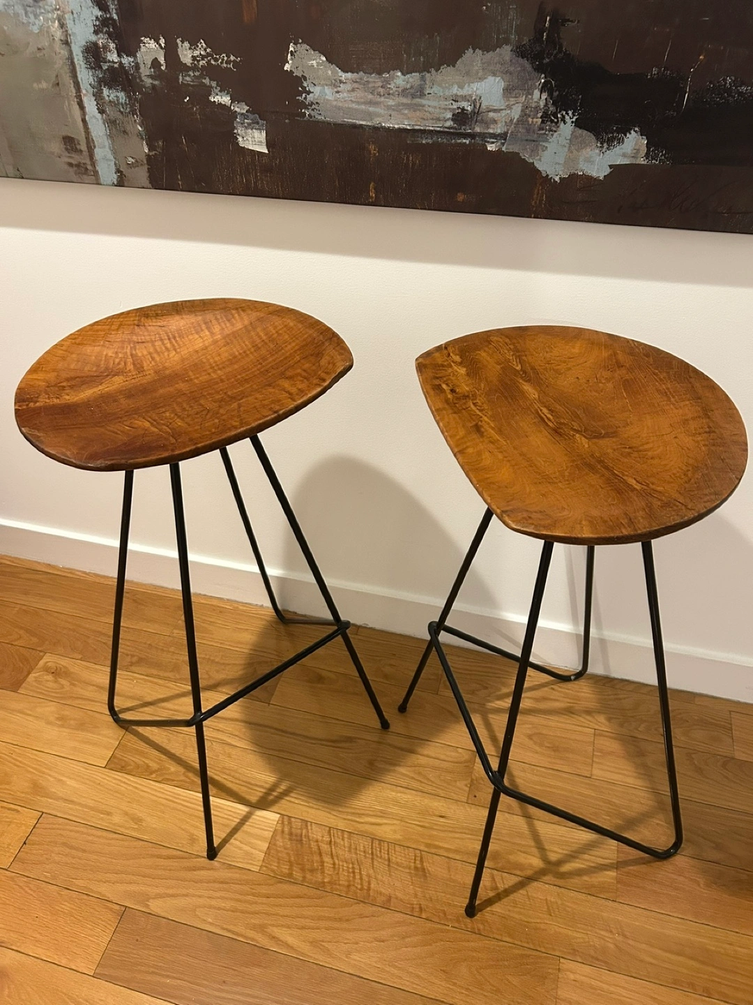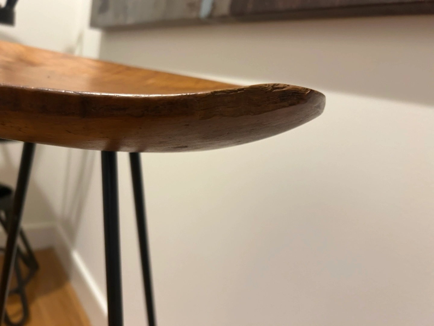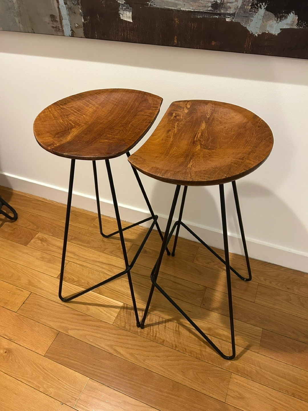 Selling a set of two wooden bar stools with black metal legs. Used for two years - few natural looking scratches but in great shape. All wood abnormalities are apart of the original look of the stool. Originally $450 each from “from the source” they are the perch model. Great for adding a rustic touch to your kitchen or bar area!