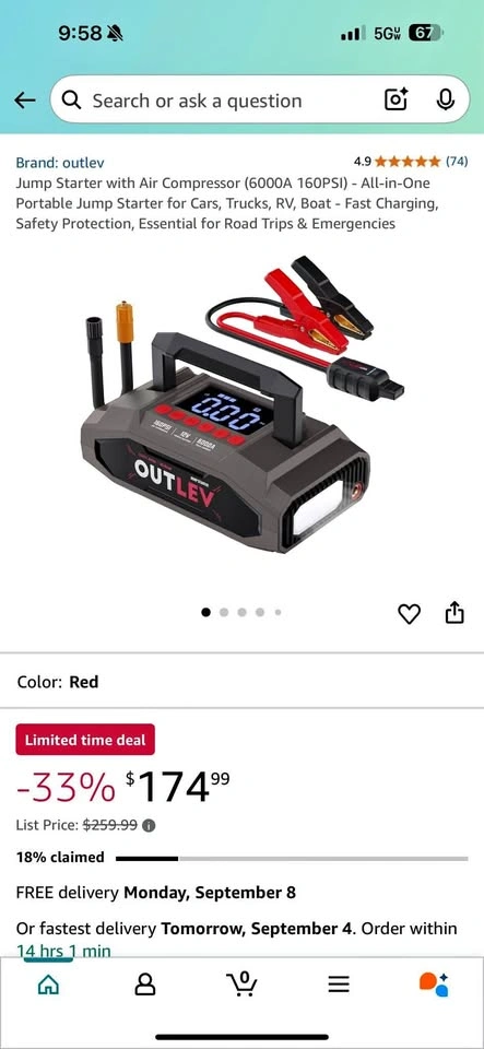 Powerful All-in-One Jump Starter & Air Compressor – Instantly jump-starts gas (up to 10.0L) & diesel engines, even in extreme temps (-20°F to 140°F). Built-in 160 PSI air compressor with presets for car, SUV, motorcycle & bike. Dual USB fast charging, 4-mode LED safety light, and 10-layer protection for worry-free use. Compact, portable, and includes all accessories + 24-month warranty. Brand new available for pick up