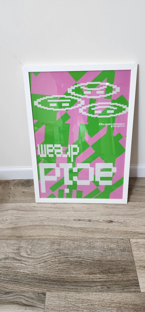1000+Selling a framed art piece with a white frame. The art features a pink and green design with the words "dream pop" and "mind cleaning".