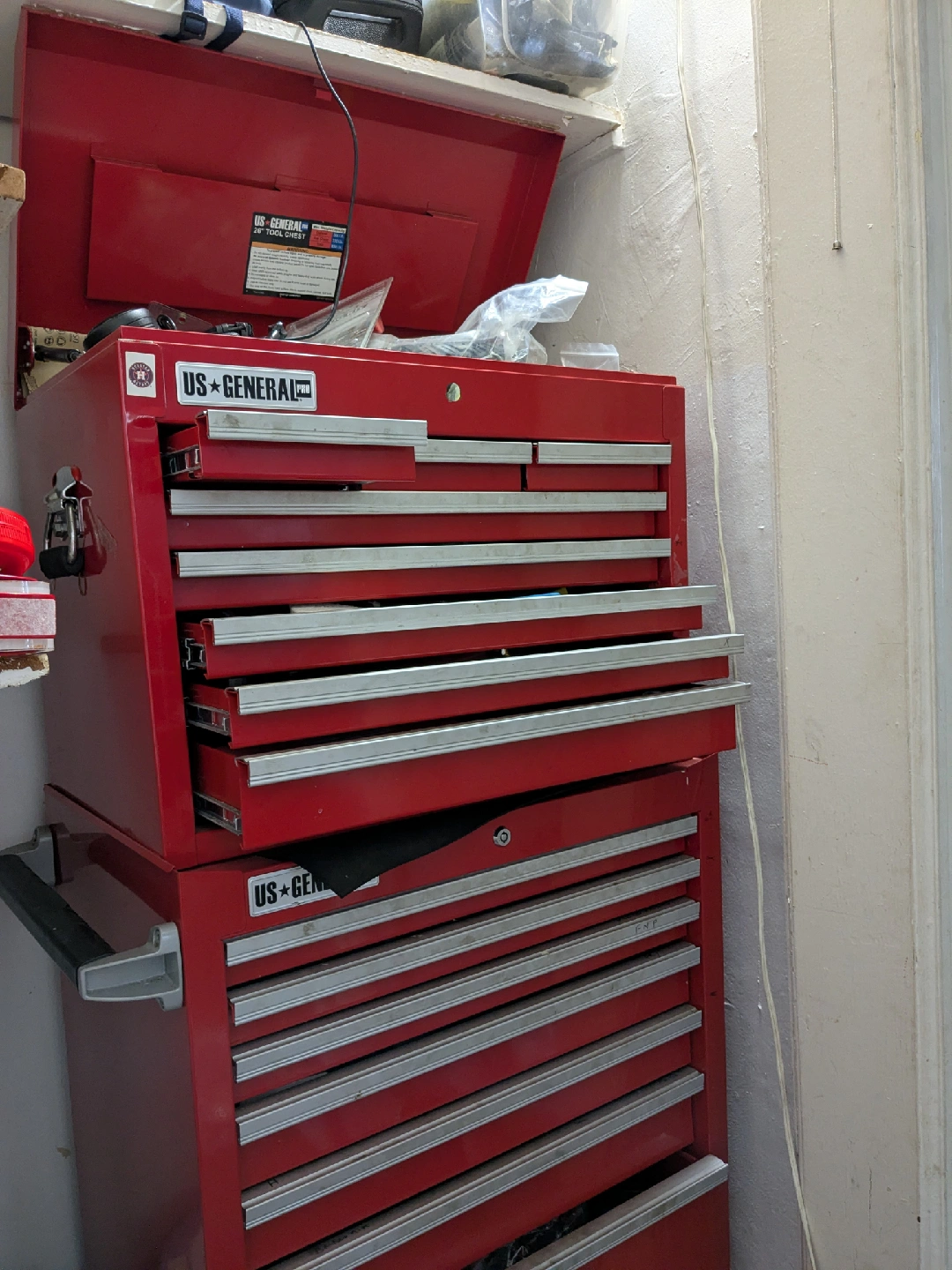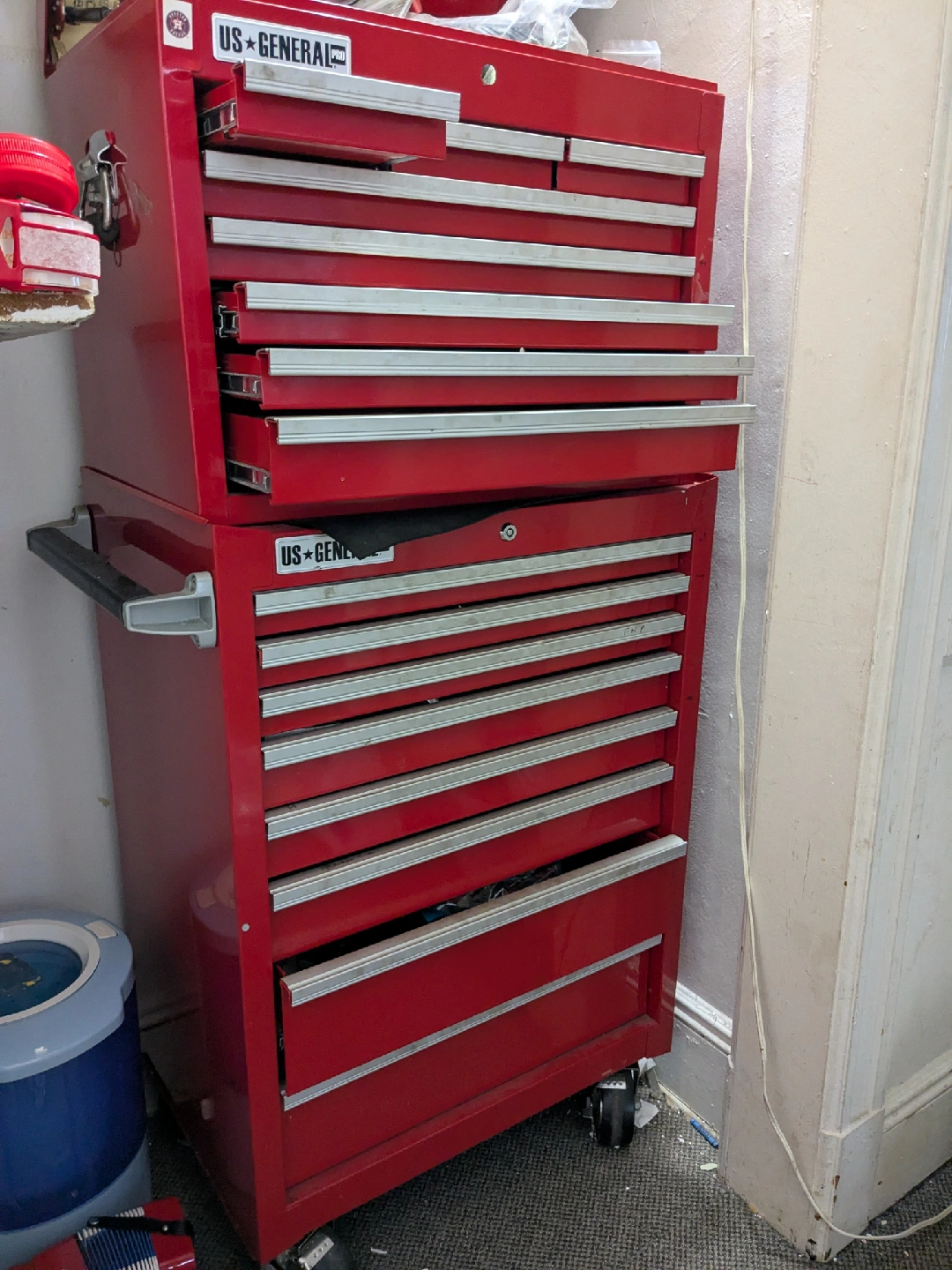 28Movin sale! a red US General tool chest. It has multiple drawers for organizing your tools, and it's a great way to keep everything in one place. there are a lot of major tools in it. It's all included if you want! No key