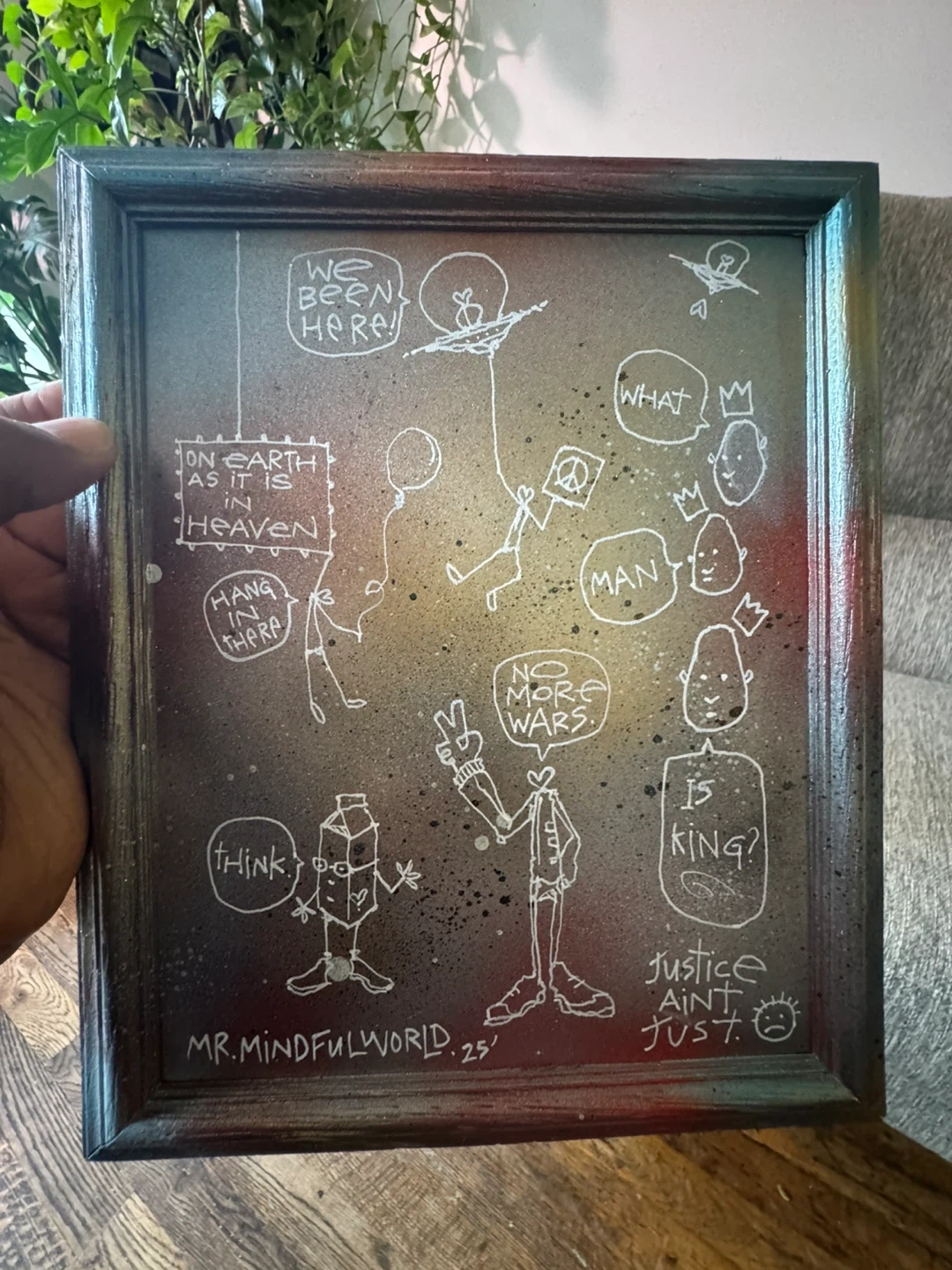 19Unique framed art piece with hand-drawn figures and thought-provoking messages. The artwork features a blend of whimsical characters and statements like "No More Wars" and "Justice Ain't Just". It's signed "Mr. Mindful World. 25".