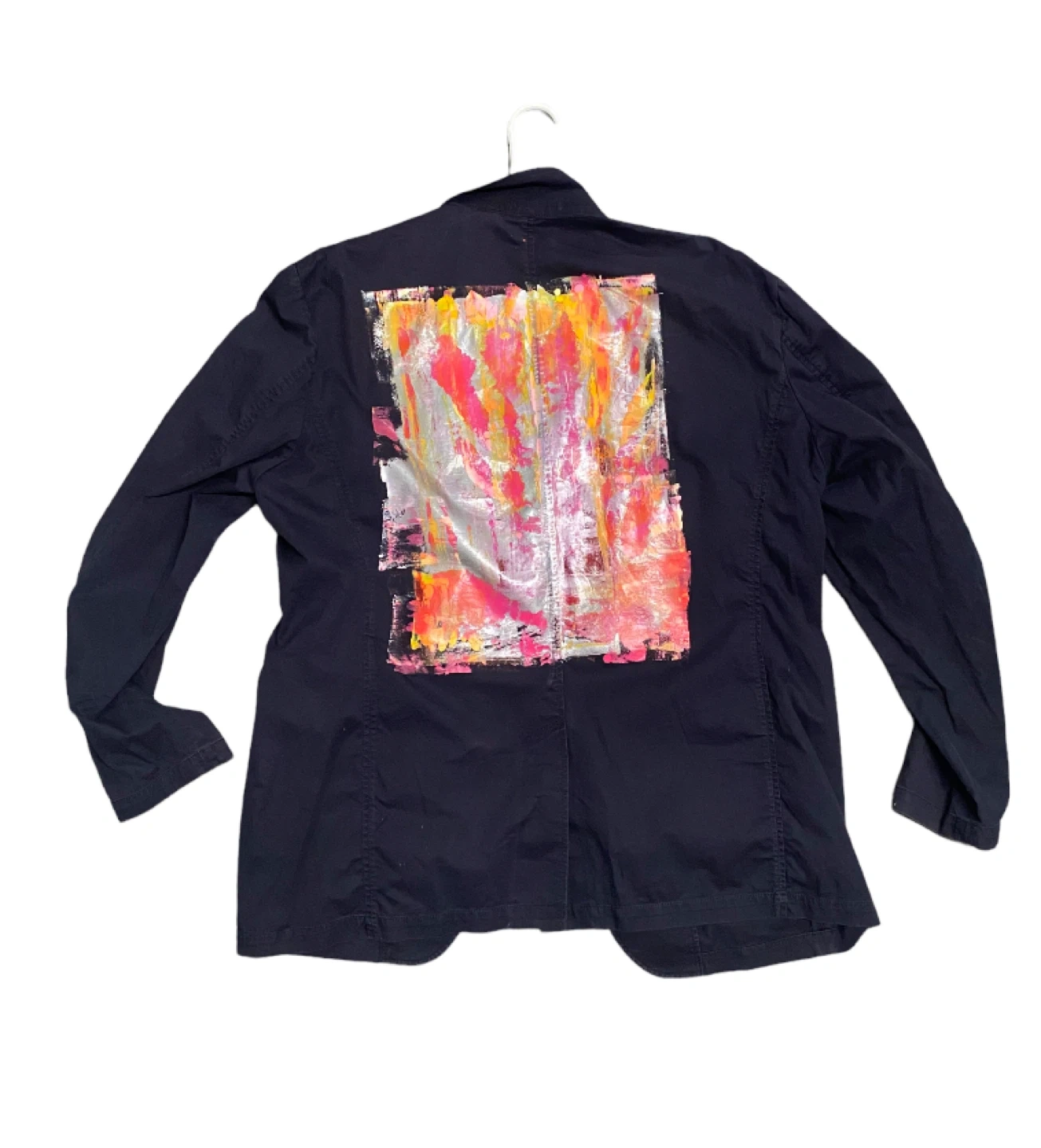 19Here's a stylish blue jacket featuring a unique abstract art design on the back. It's perfect for adding a touch of individuality to your wardrobe. Handpainted by Mr. Mindful.