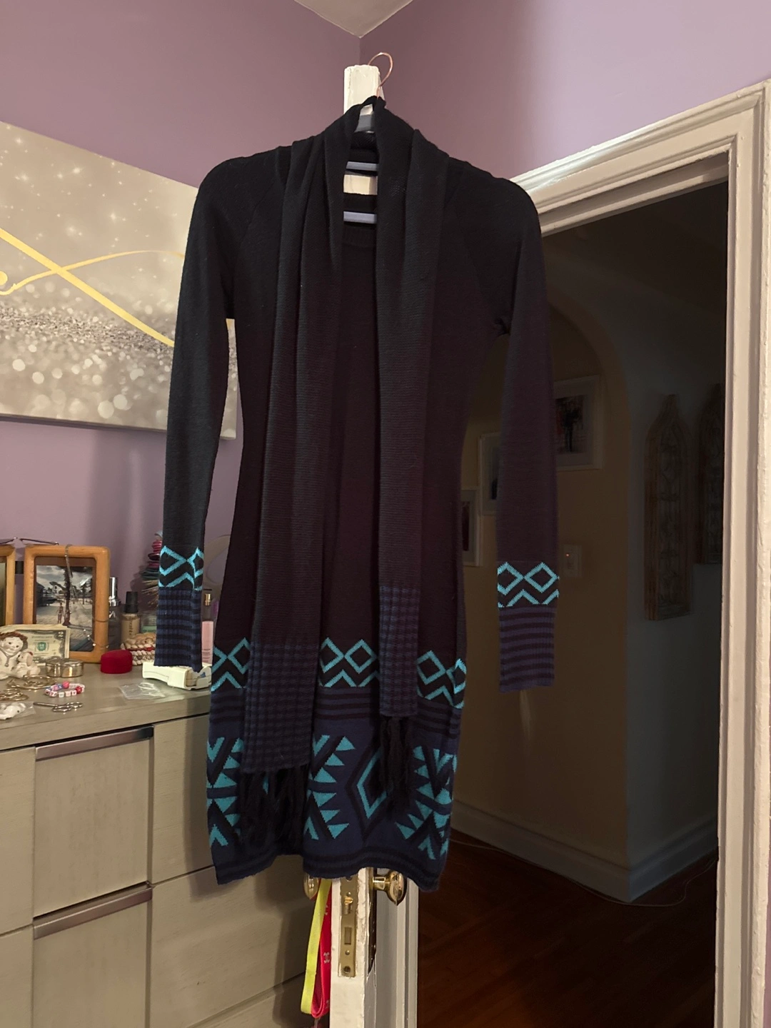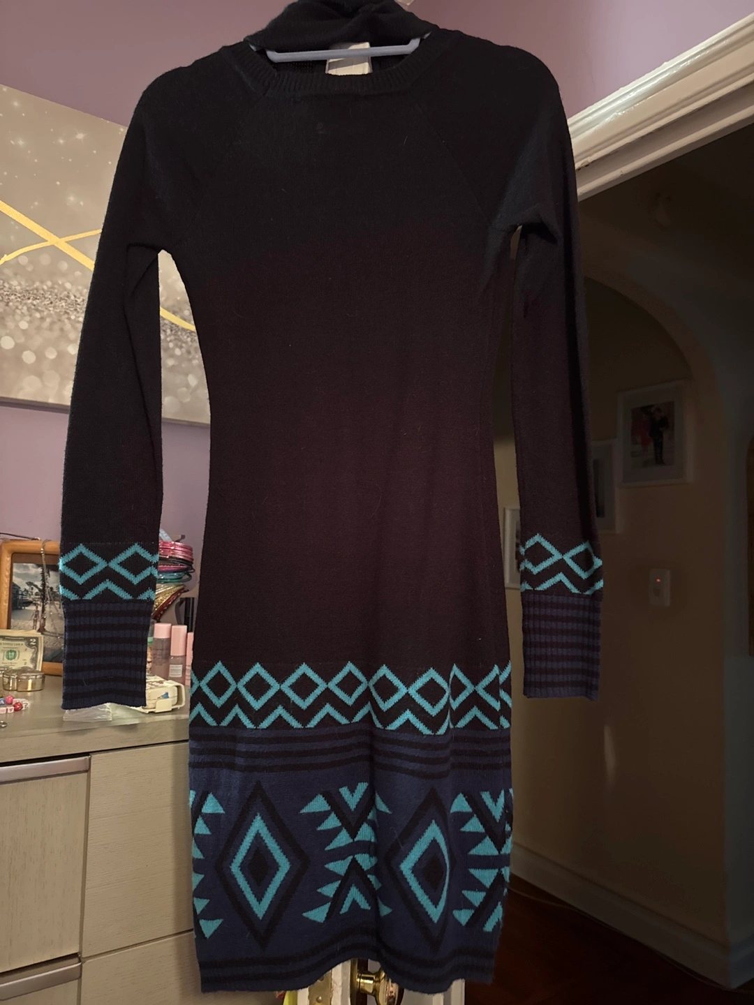 Selling a cute Energie black knit dress in size small! It features a unique geometric pattern in blue and turquoise. Perfect for layering or wearing on its own