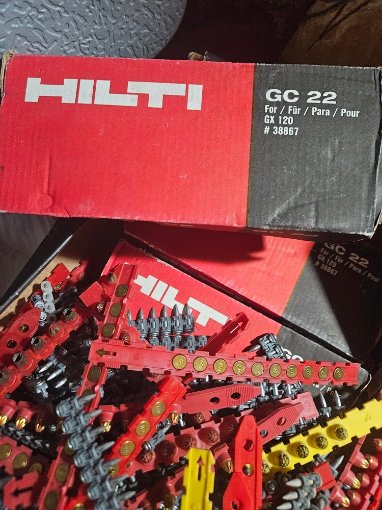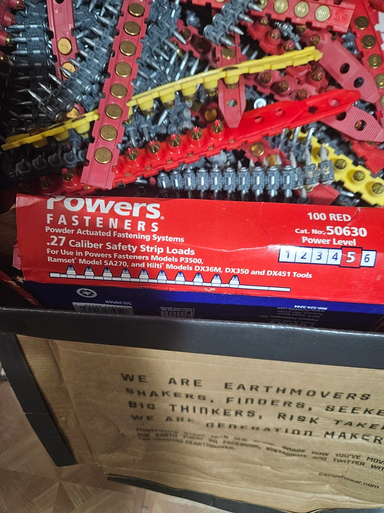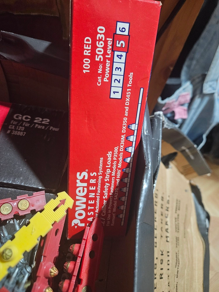 Selling Powers Fasteners .27 Caliber Safety Strip Loads, for use in Powers Fasteners Models P3500, Ramset Model SA270, and Hilti Models DX36M, DX350 and DX451 Tools. Also includes a box of Hilti GC 22 for GX 120 #38867