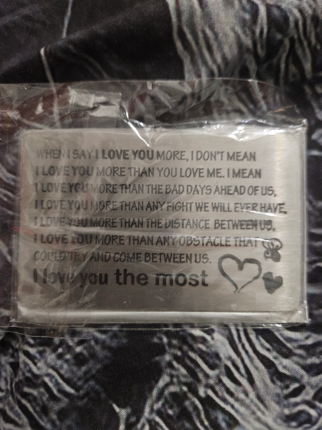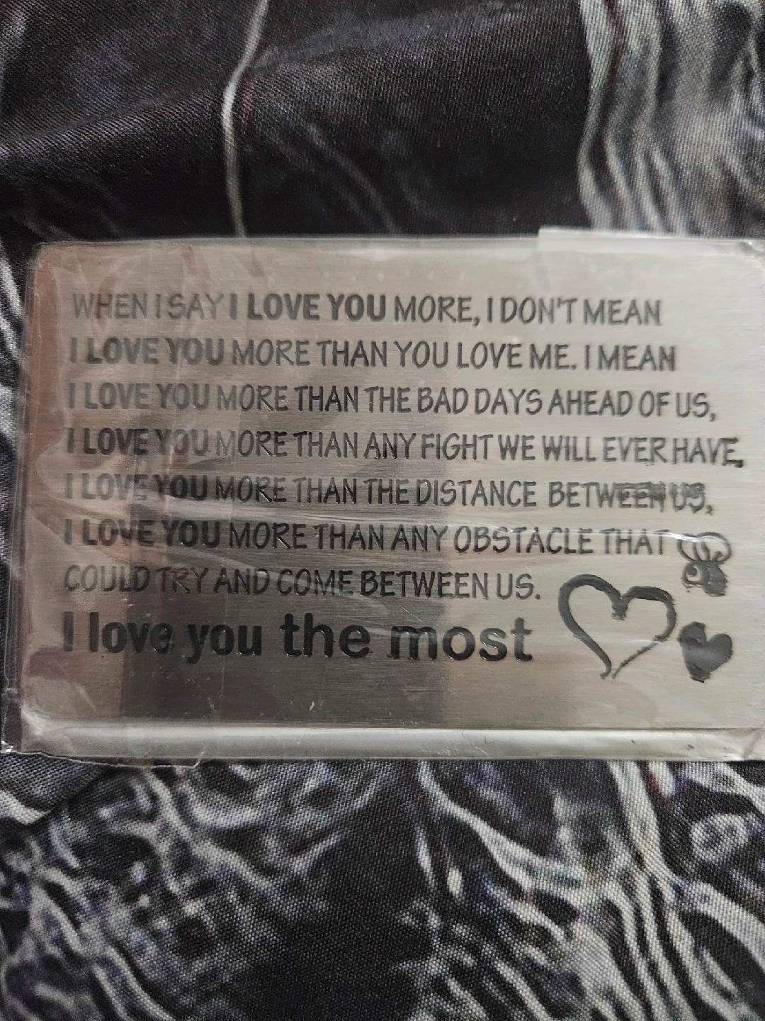 This metal wallet insert card says 'When I say I love you more, I don't mean I love you more than you love me. I mean I love you more than the bad days ahead of us, I love you more than any fight we will ever have, I love you more than the distance between us, I love you more than any obstacle that could try and come between us. I love you the most'