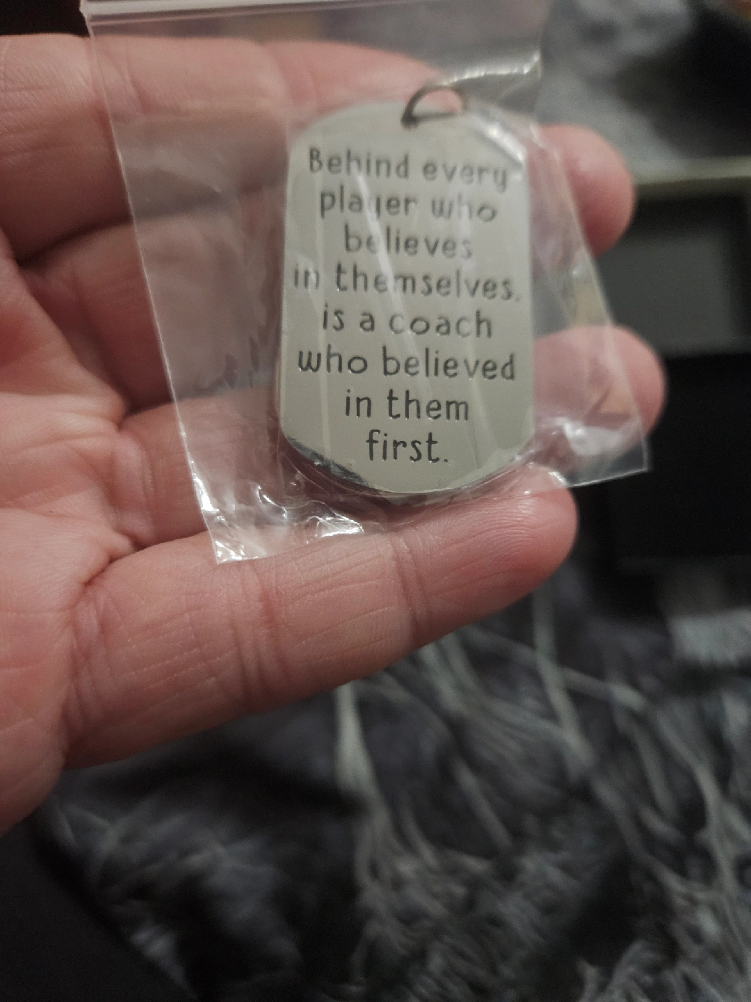 I'm selling a Delujouberst coach dog tag pendant. It comes in its original box and packaging. One side reads, "Behind every player who believes in themselves, is a coach who believed in them first," and the other side is a heart that reads "Best Coach Ever"