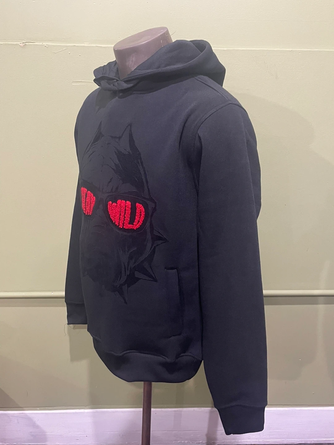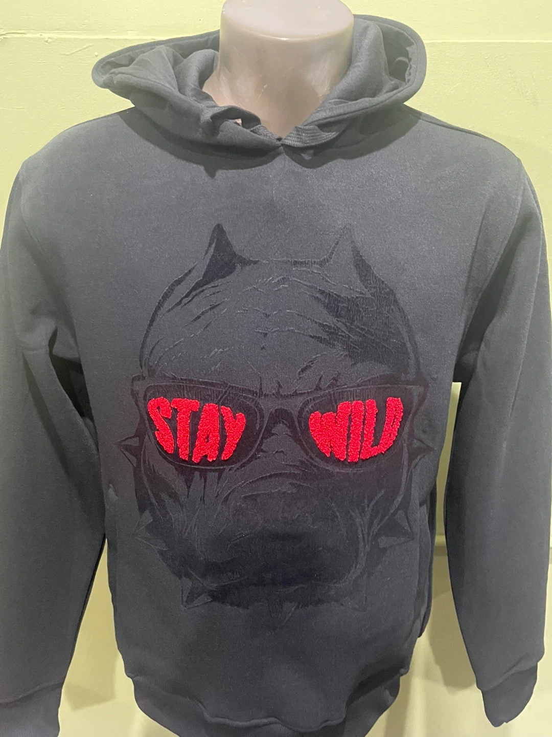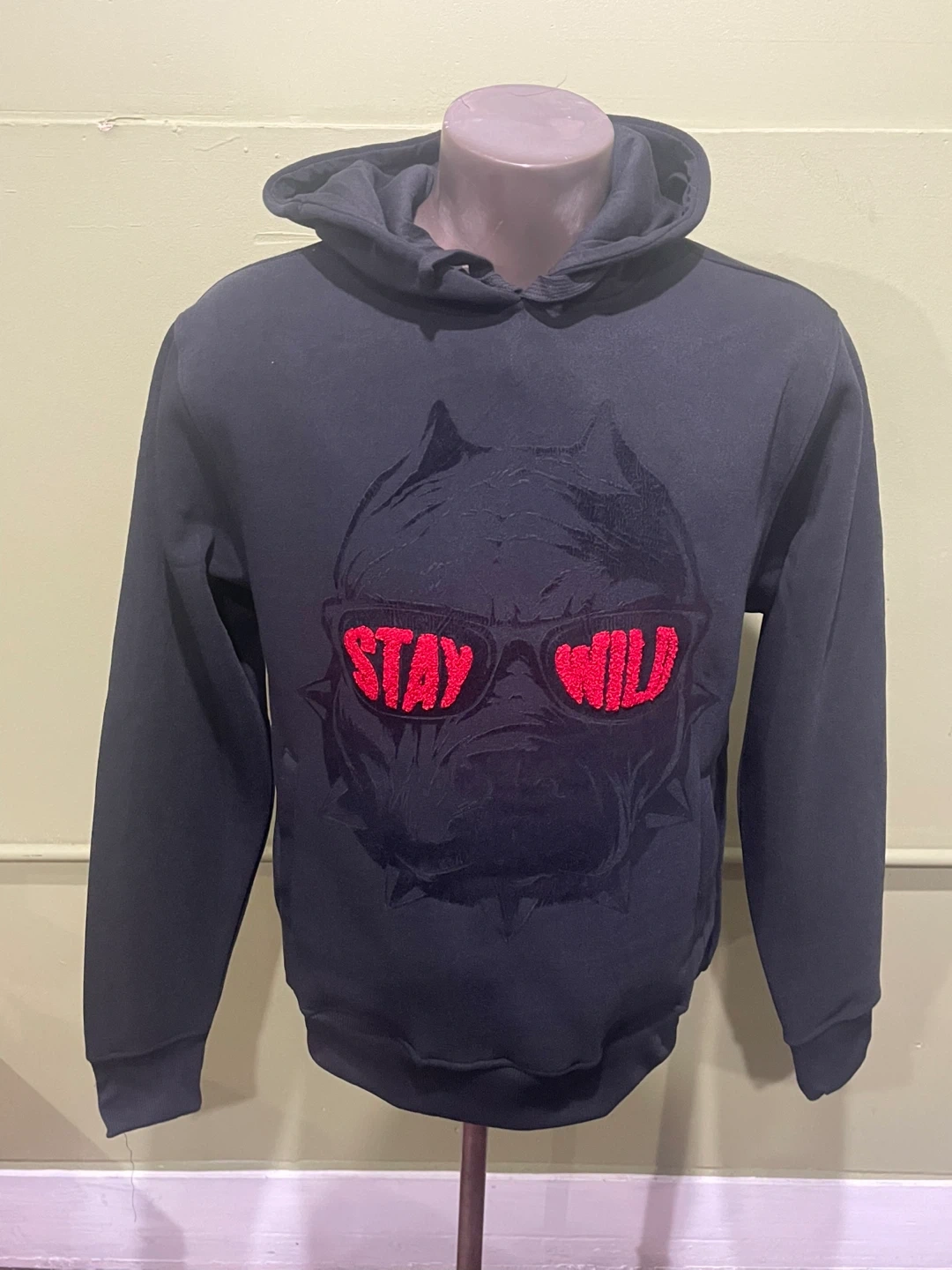 Selling a black hoodie with a cool design! The front features a graphic with the words 'Stay Wild' in red. It's a stylish and comfortable hoodie, perfect for casual wear.