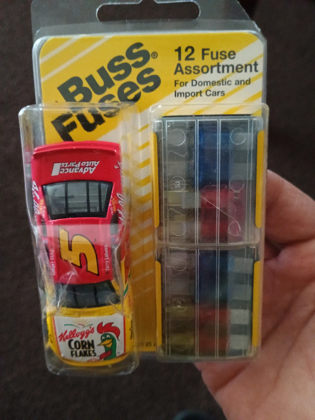 I'm selling a Buss Fuses 12 Fuse Assortment For Domestic and Import Cars, plus a Kellogg's Corn Flakes race car