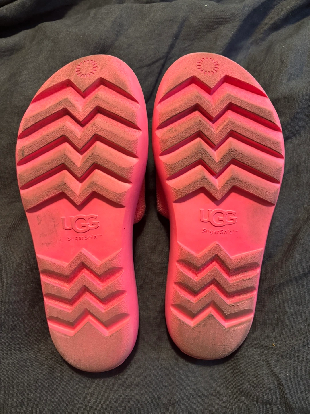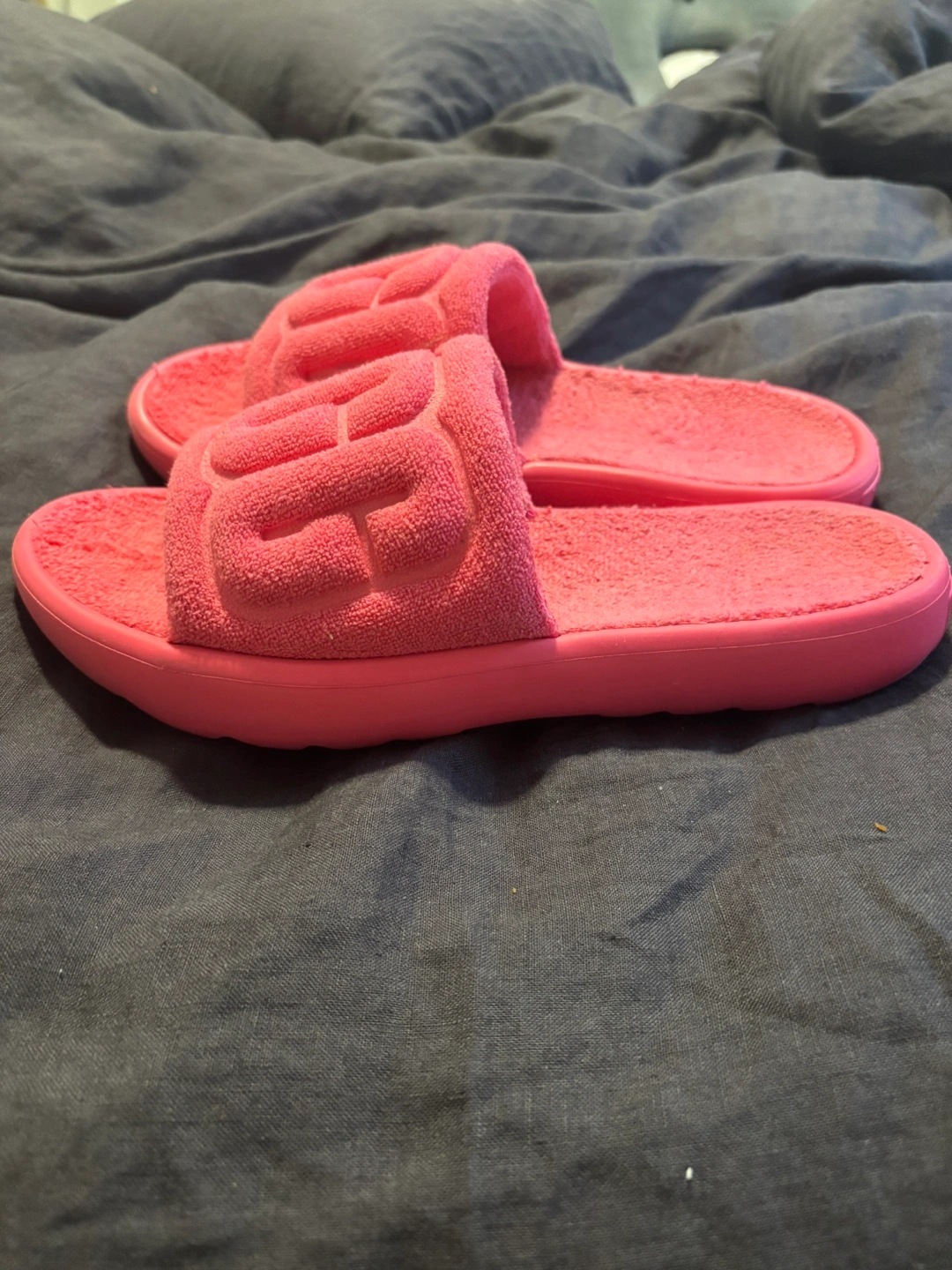 Selling a pair of UGG slides in pink terry cloth! They're a size 7 and have the UGG logo embossed on the top. The soles are UGG SugarSole™.