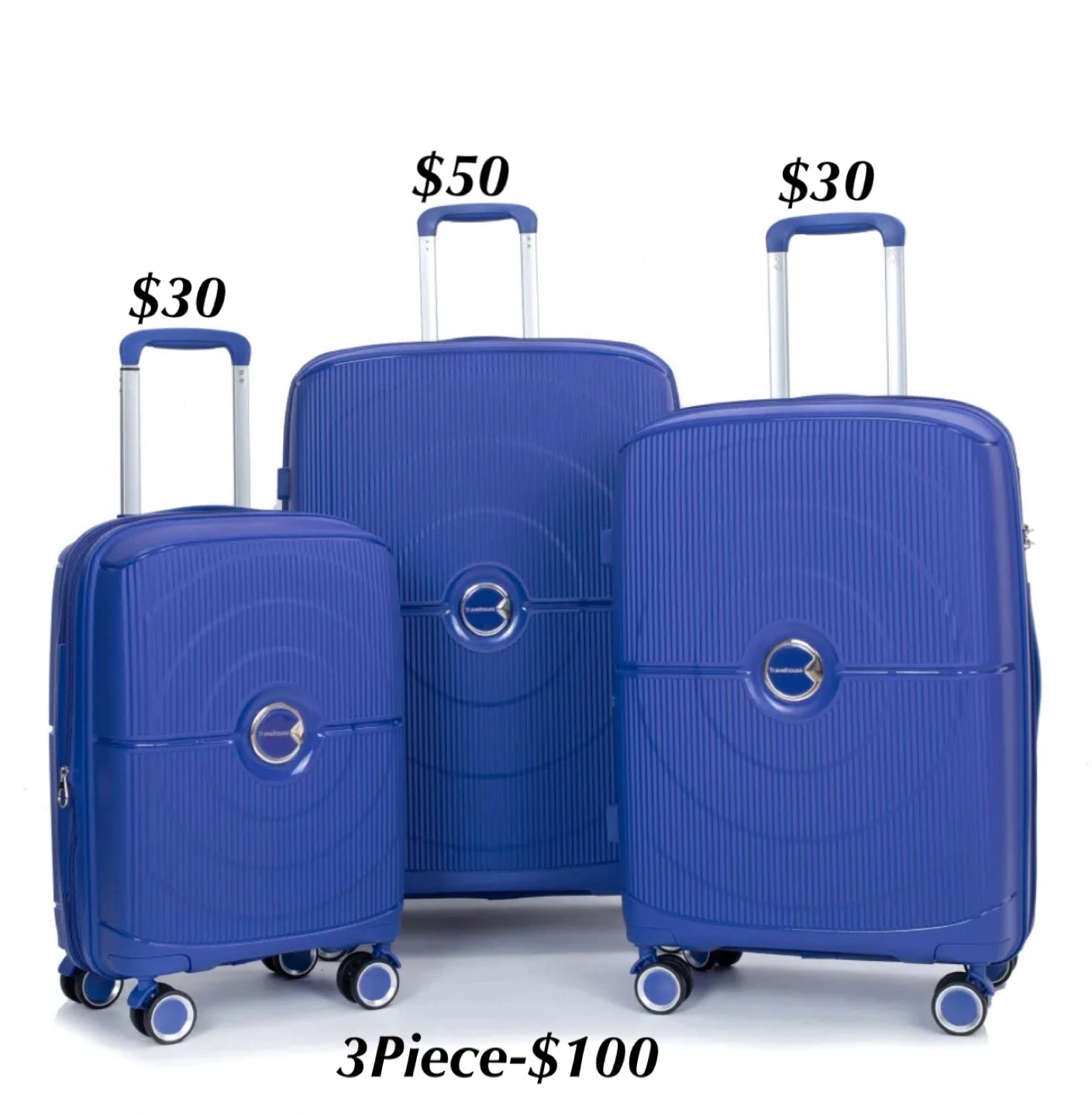 35Selling a Travelhouse 3-piece luggage set! The set includes three suitcases in varying sizes, all in a matching blue color. Great for all your travel needs!