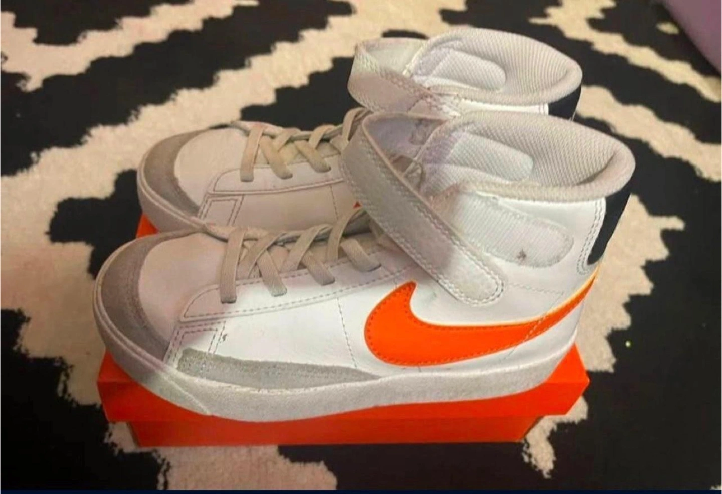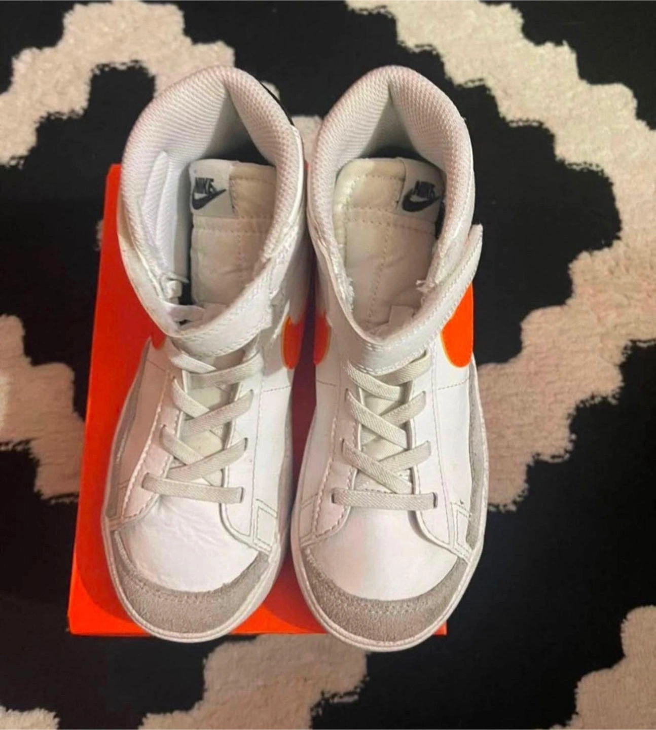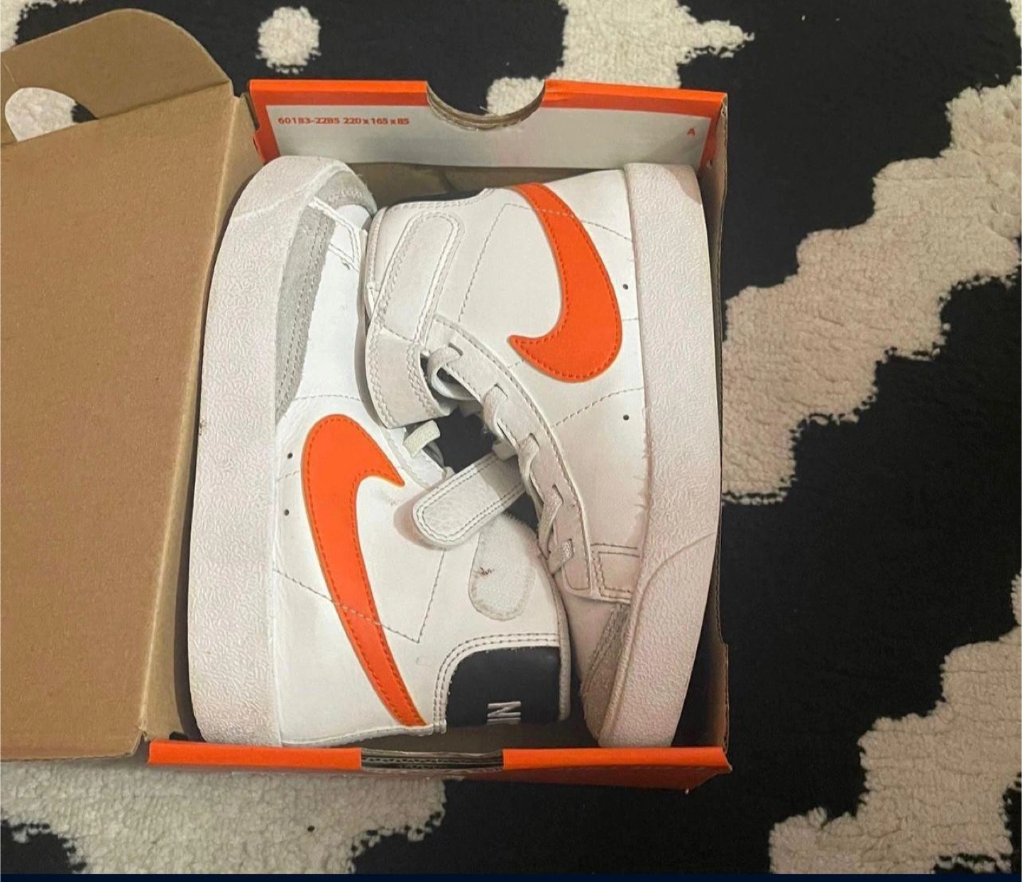 95Selling a pair of Nike Blazer Mid '77 toddler shoes in size 1Y !These cute sneakers feature a white and orange colorway with the iconic Nike swoosh. They come with the original box! RETRO LOOK. TRUSTED COMFORT. For kids 6-9 years Your little baller can rule the sneaker game in the Nike Blazer Mid '77. They were given to my son as a gift. He used them twice and they are like new. He is selling them because he doesn't like them anymore. The vintage look and comfortable feel help this court classic transcend the hardwood into a legend of street style. Solid rubber sole delivers traction and durability. Mid-rise collar provides stability and a natural fit for little feet. Elastic laces and a hook-and-loop strap create a secure fit that's easy to take on and off. size 1Y