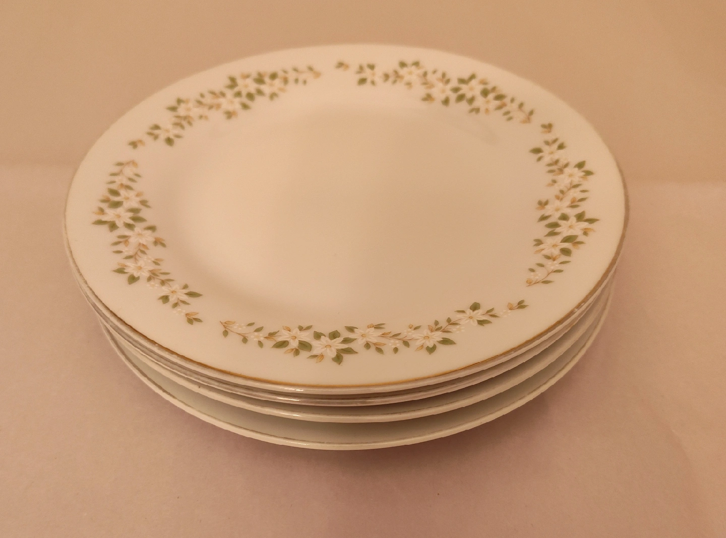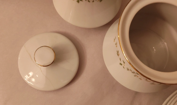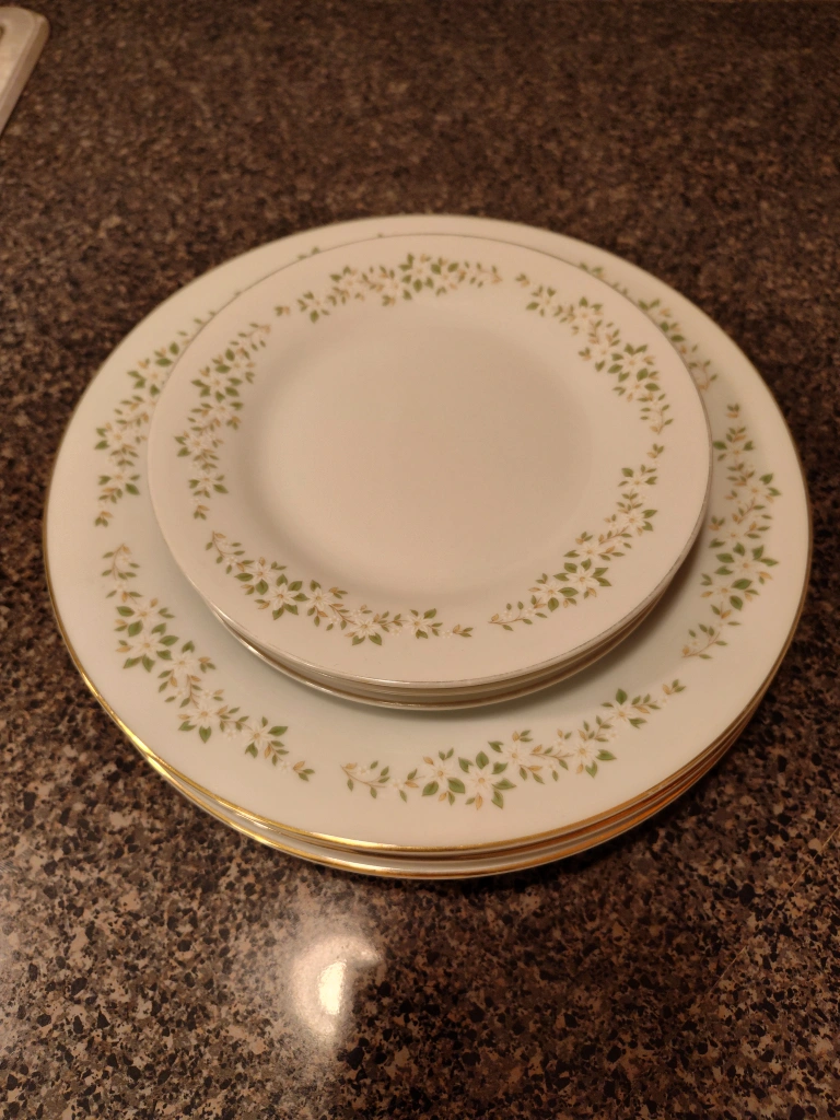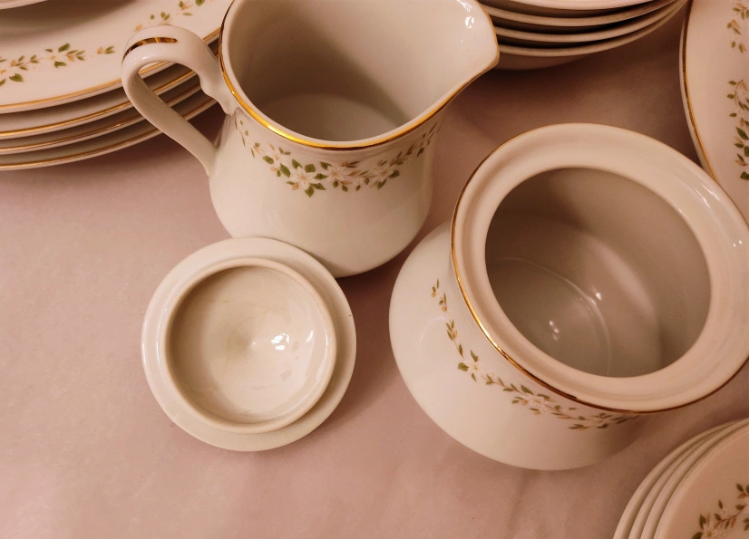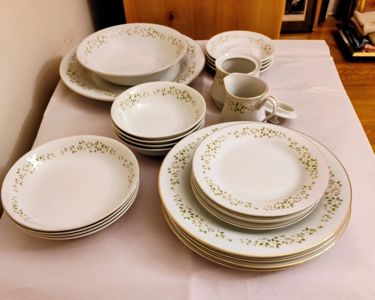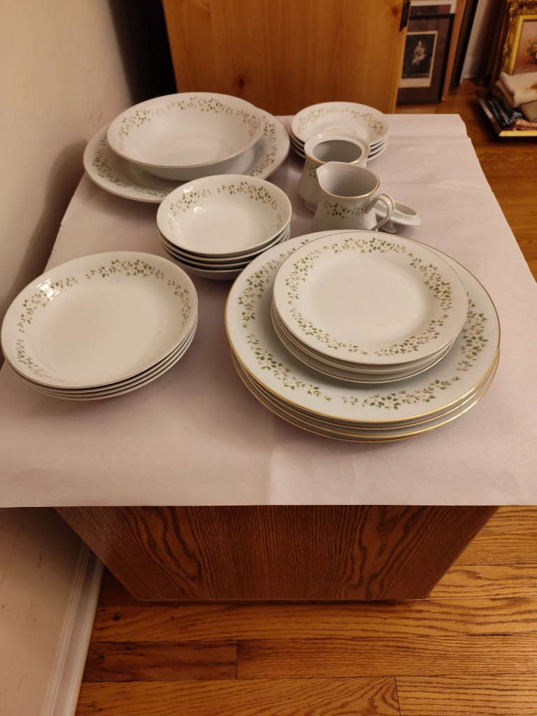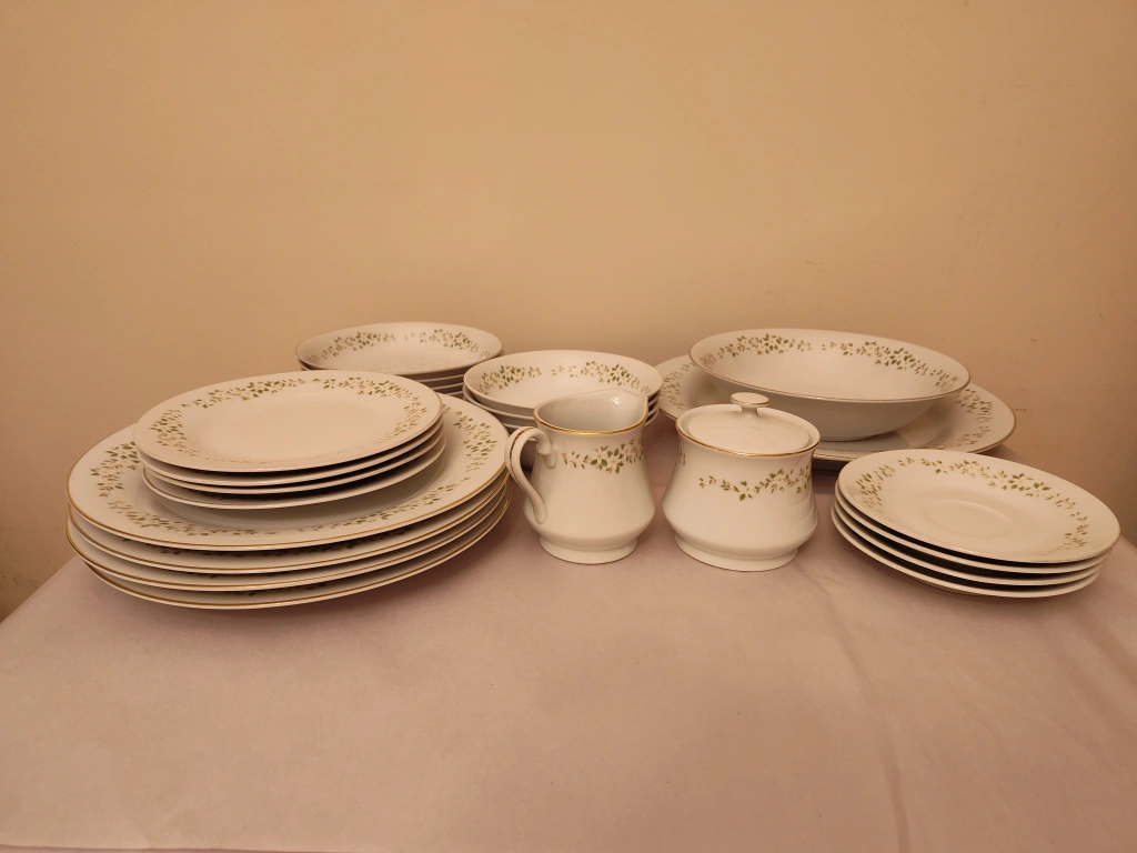 Selling a beautiful vintage Ekco/Eterna Fine China dinnerware set. This set includes 24 pieces... plates, bowls, and serving pieces, all adorned with a delicate floral pattern and gold trim. Perfect for adding a touch of elegance to your dining experience! No chips or cracks on any of the pieces. There's a very fine crazing (superficial crack in the glaze of the sugar caddy cover. See photos 6 and 7. The rest of the set is in excellent shape. Spring Meadow by Ekco Products. On replacements Dot Com one dinner plate is selling for $19.99 not including delivery (see photo 8).
