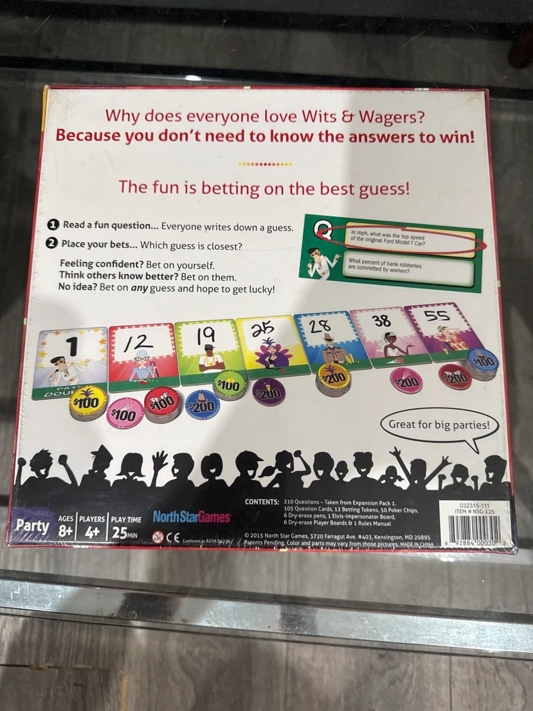 Selling a Wits & Wagers Party Edition board game! It's a fun and engaging game for ages 8+ and 4+ players. The game includes 210 Question Cards, 105 Question Cards, 12 Betting Tokens, 50 Poker Chips, 6 Dry-erase Player Boards & 1 Rules Manual. Great for parties!