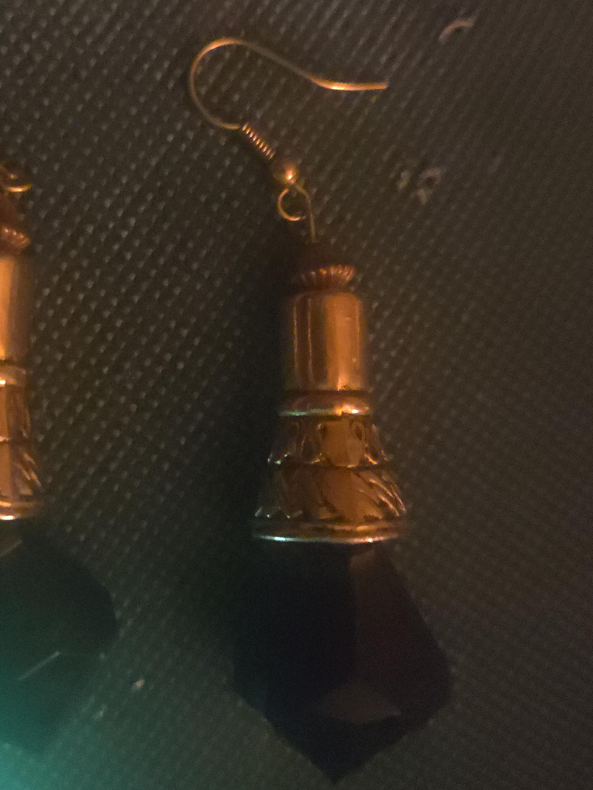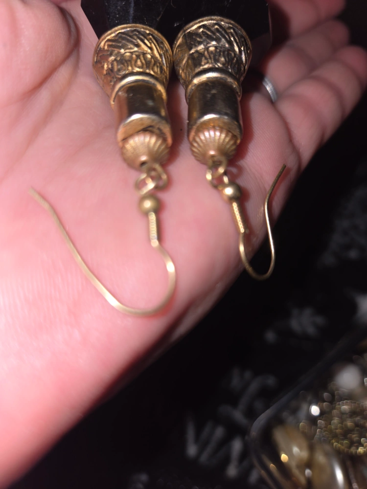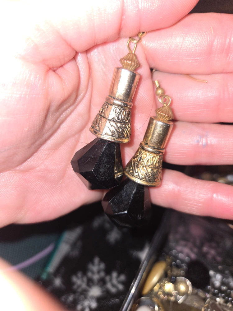 These are a pair of unique dangle earrings featuring black gemstones and gold-tone metal accents. They have a vintage look and would be a great addition to any jewelry collection