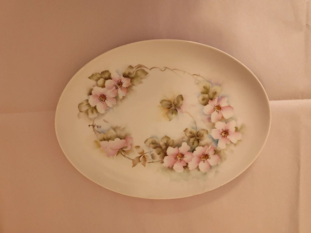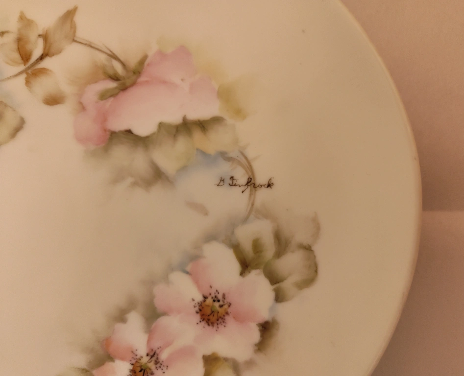 Beautiful hand-painted decorative plate featuring delicate pink flowers and green leaves. The artist's signature, "G. Linfrock," is visible on the plate. It's in great condition and would make a lovely addition to any home!