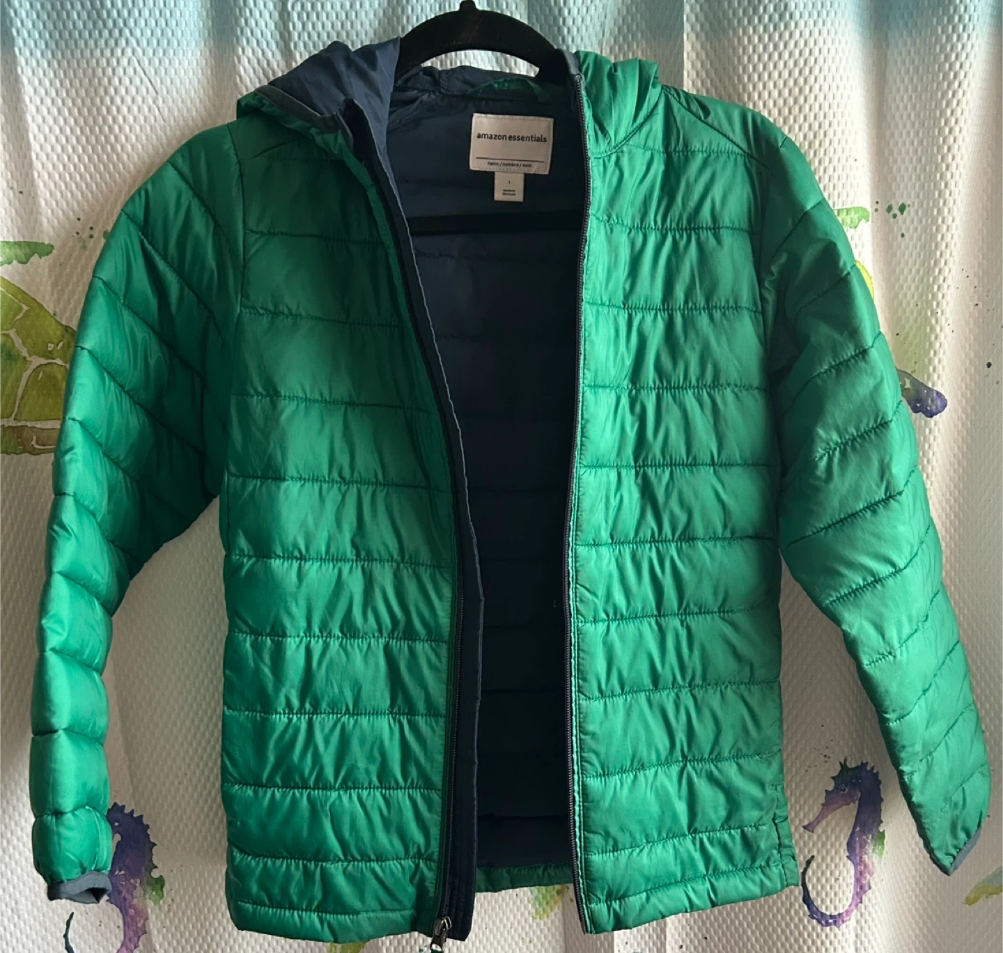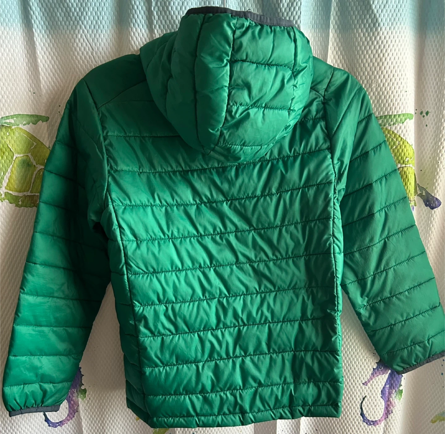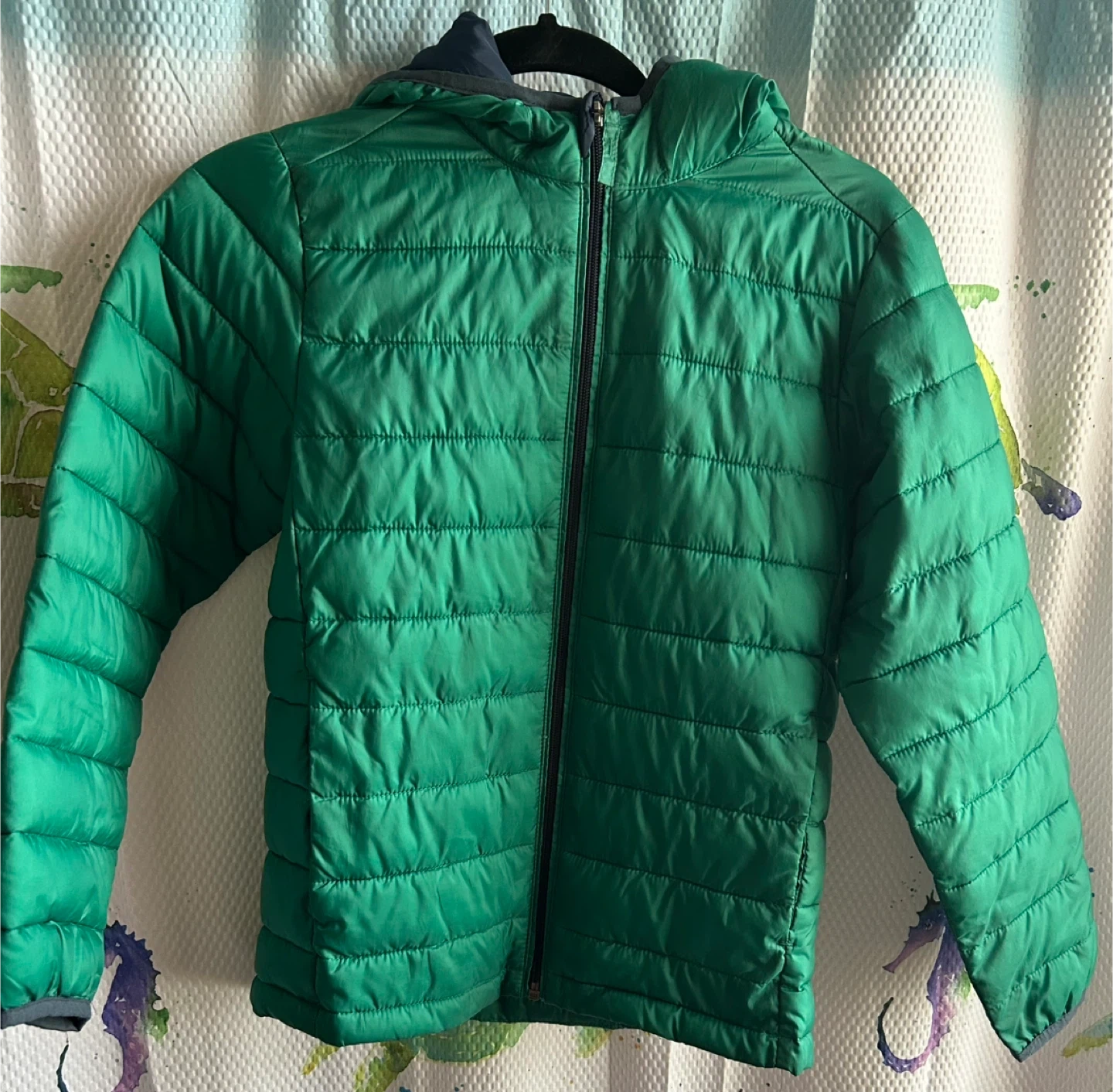 110Gently used , Keep your child warm and stylish with this vibrant green puffer jacket with hood. Perfect for chilly days. Size Large